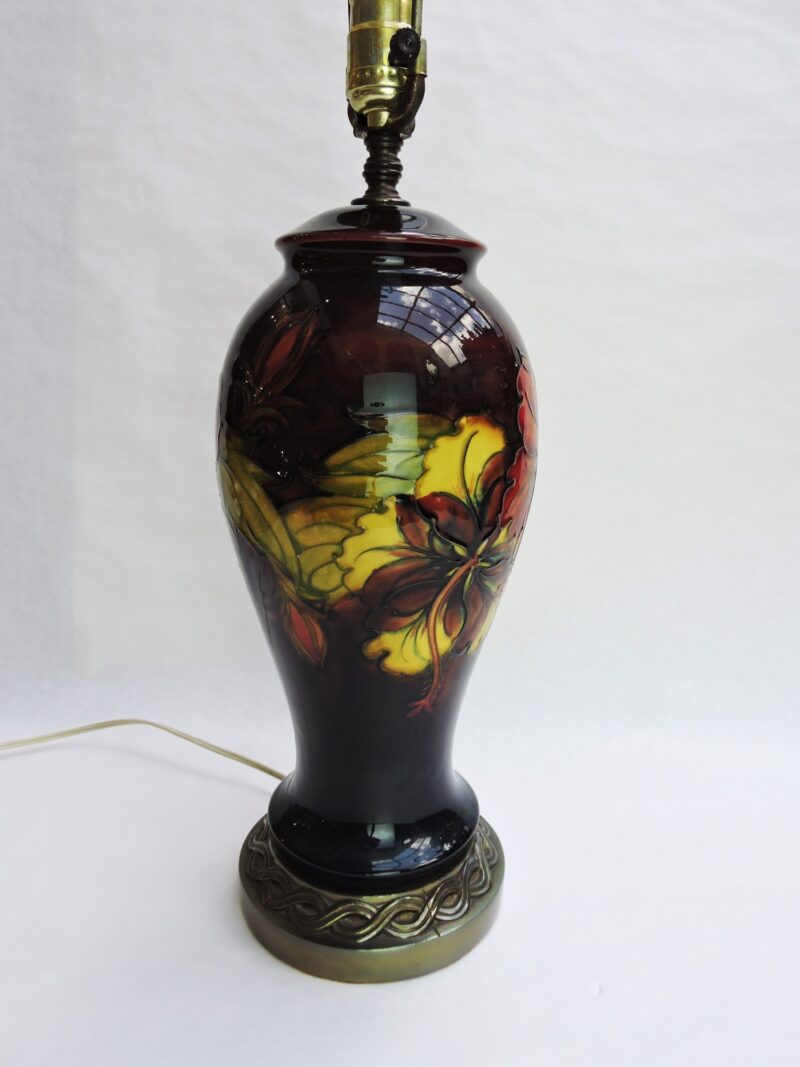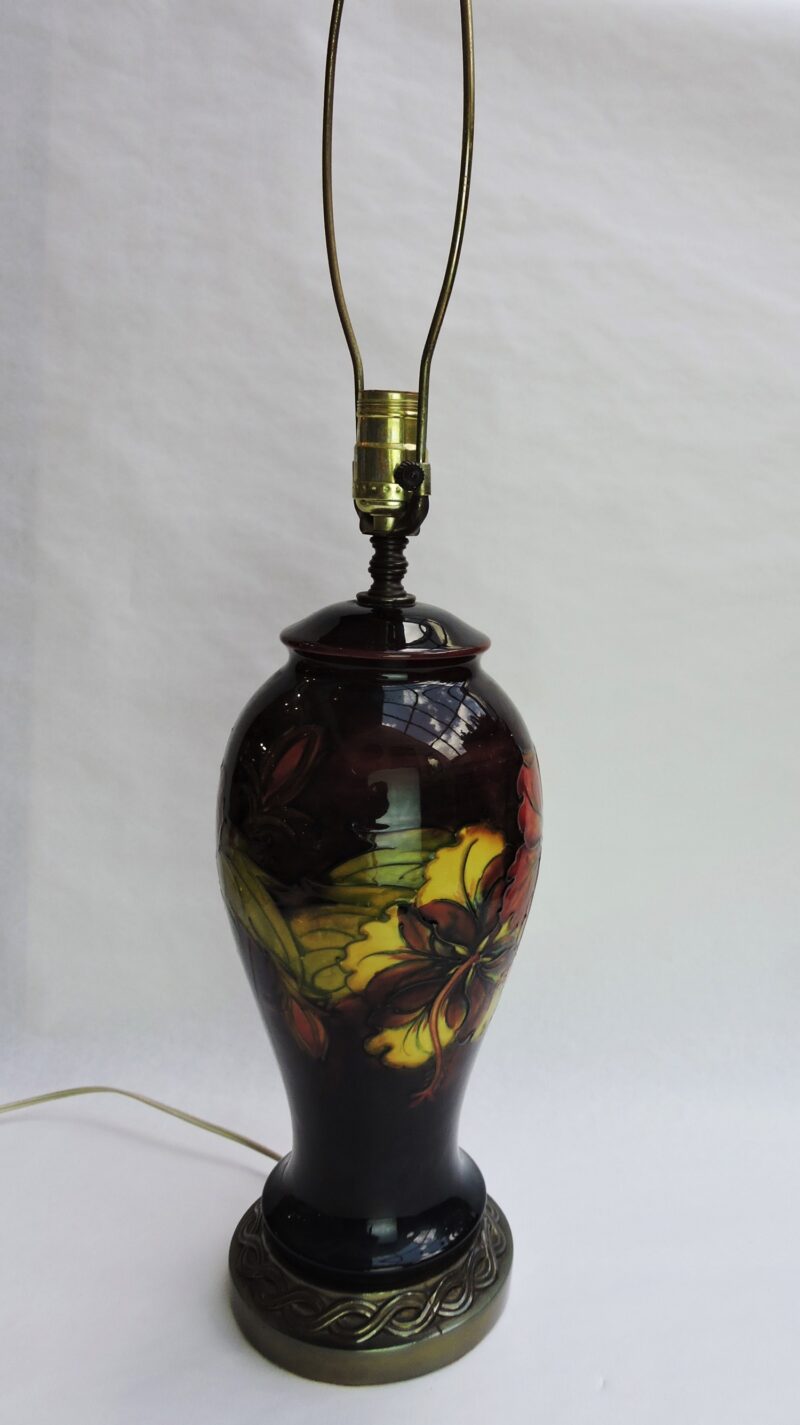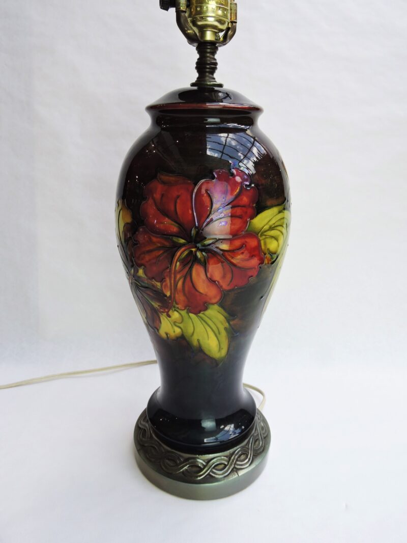 Lighting, PotteryA Moorcroft Flambé glaze pottery lamp in the Hibiscus pattern in good working order. The flambé brings out bright colours in the Hibiscus pattern with large red, purple, and yellow flowers with orange buds and green leaves over a deep red background. This pattern was one of Walter Moorcroft’s designs and dates mid 1940’s to early 1950’s. The flambé glaze was always more difficult to produce as they had to fire it at intense heat that would often break the pottery – so the flambé is more rare.