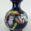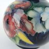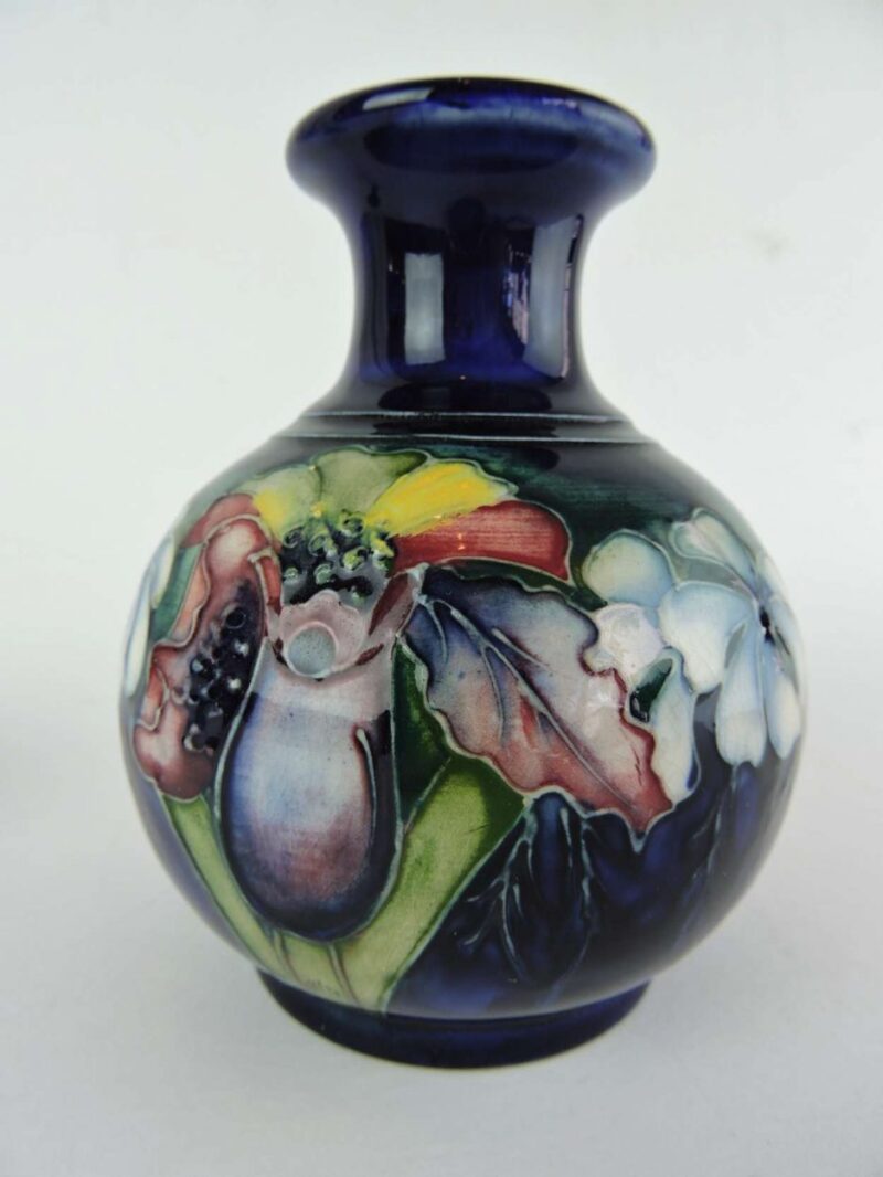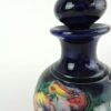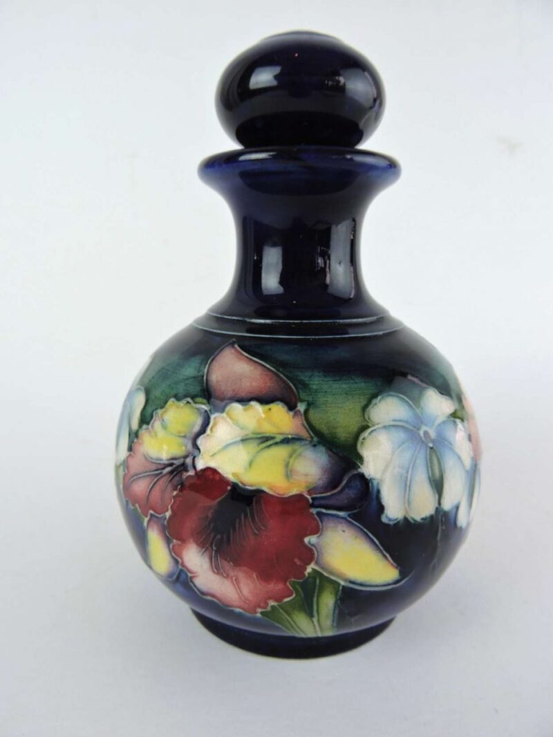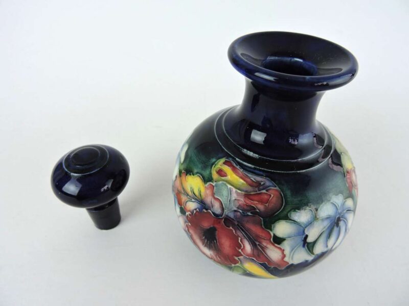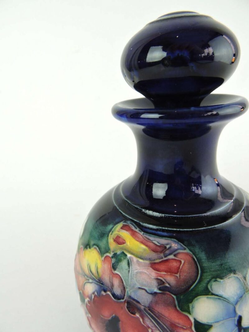 A beautiful pottery perfume bottle and lid by Moorcroft in the “Orchid” pattern. The main body of the bottle is in a deep blue with a matching solid blue lid. The hand-painted “Orchid” pattern around the bottle has colours of yellow, green, violet and red decorating the orchids and leaves. The pattern was created by Walter Moorcroft and dates in the 1950s.