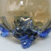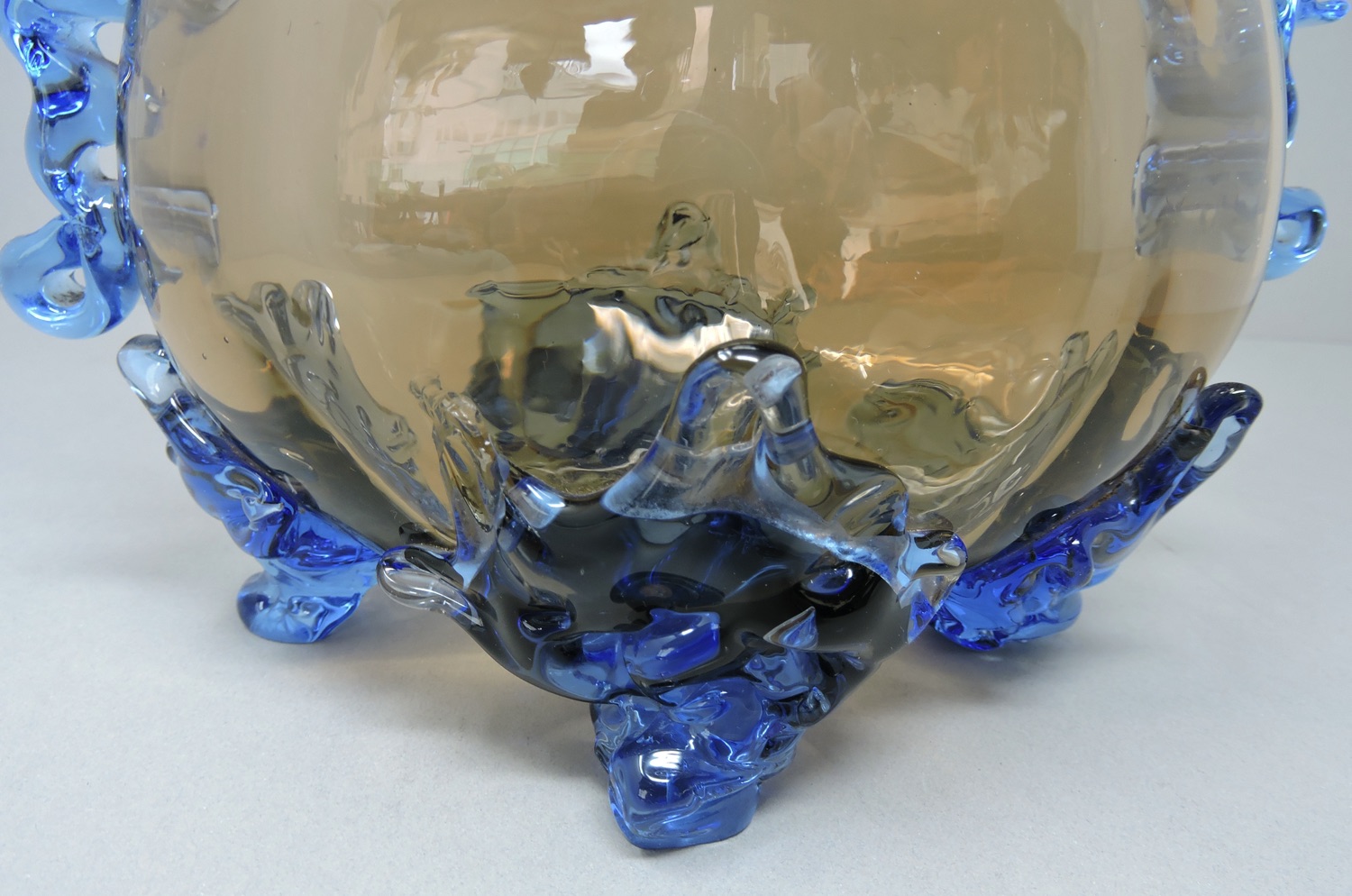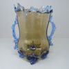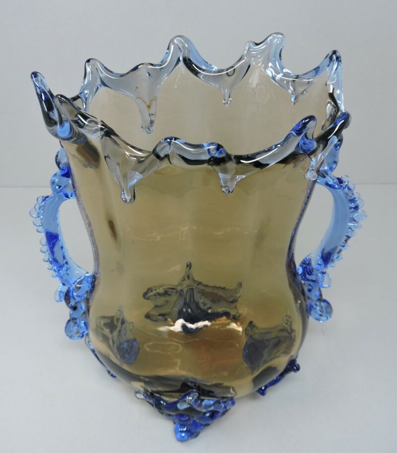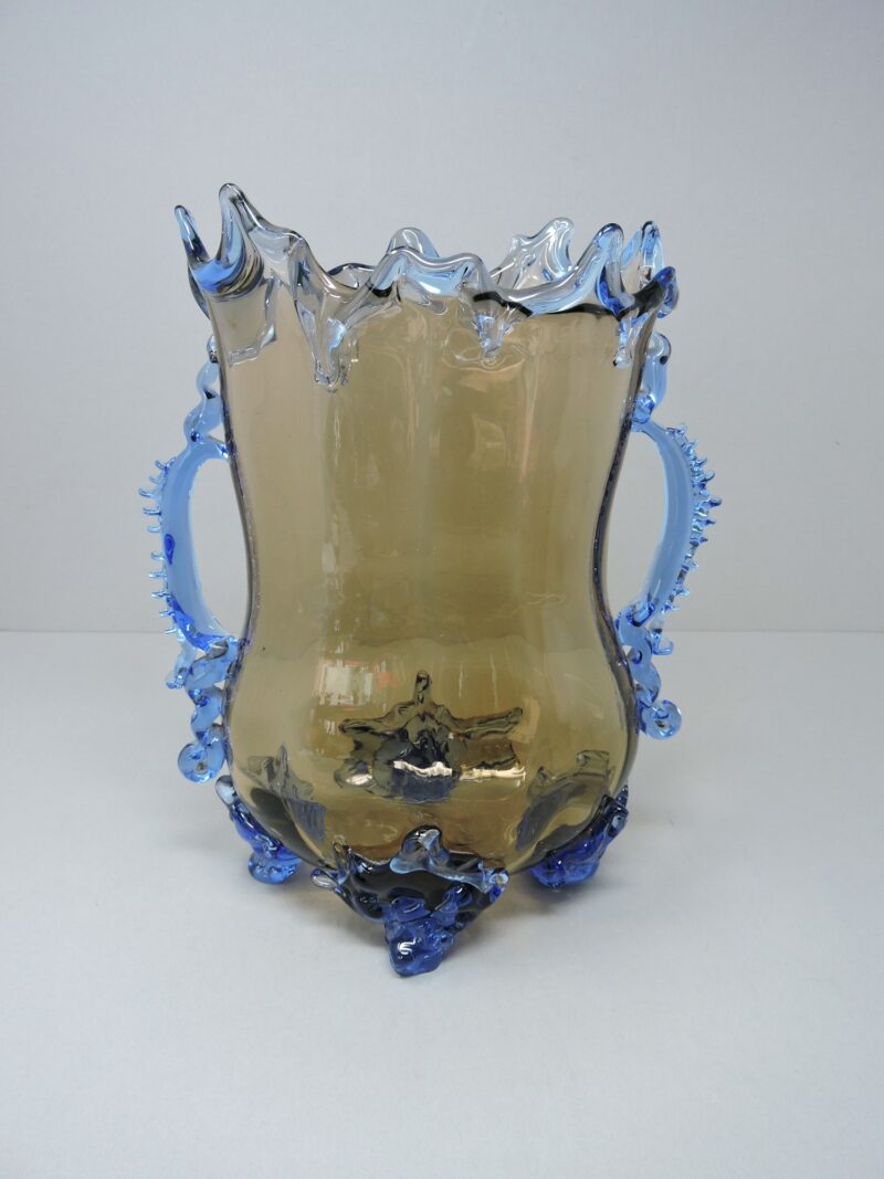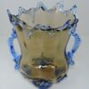 A Murano / Venetian Italian art glass vase, c. 1950. The vase has two handles and 4 feet. The body of the vase is amber glass while the rim, handles and feet are in a beautiful blue glass. The vase is 9 inches wide from handle to handle and stands 10 1/4 inches tall from the top of the rim to the feet.