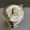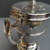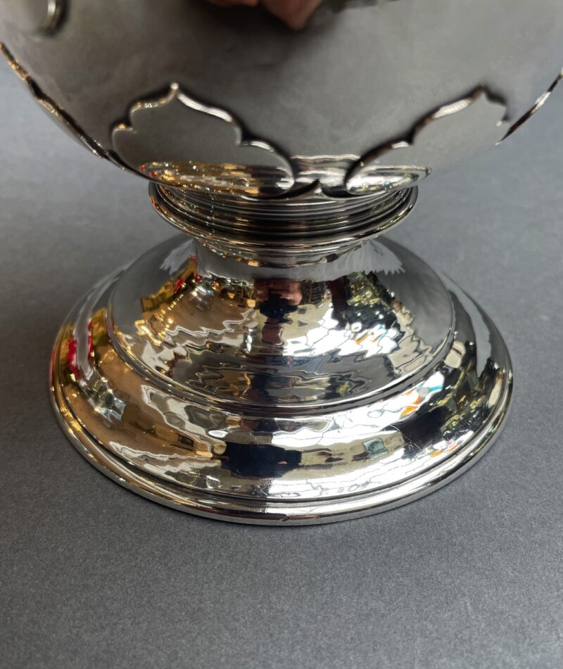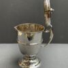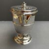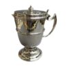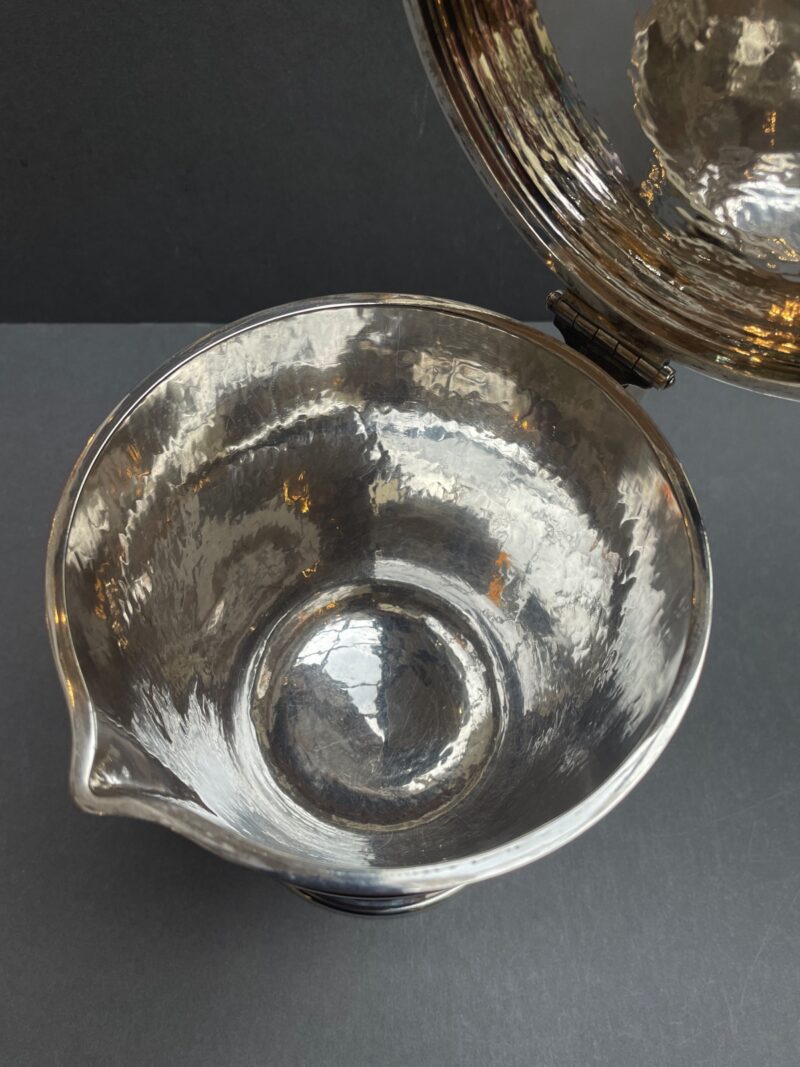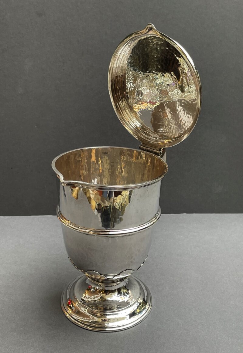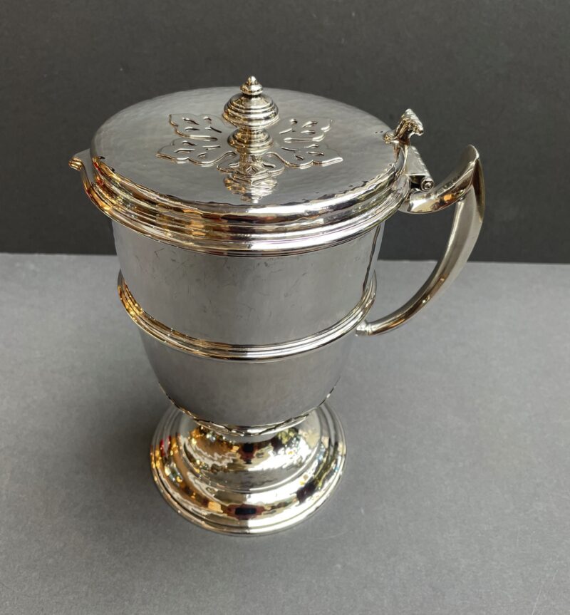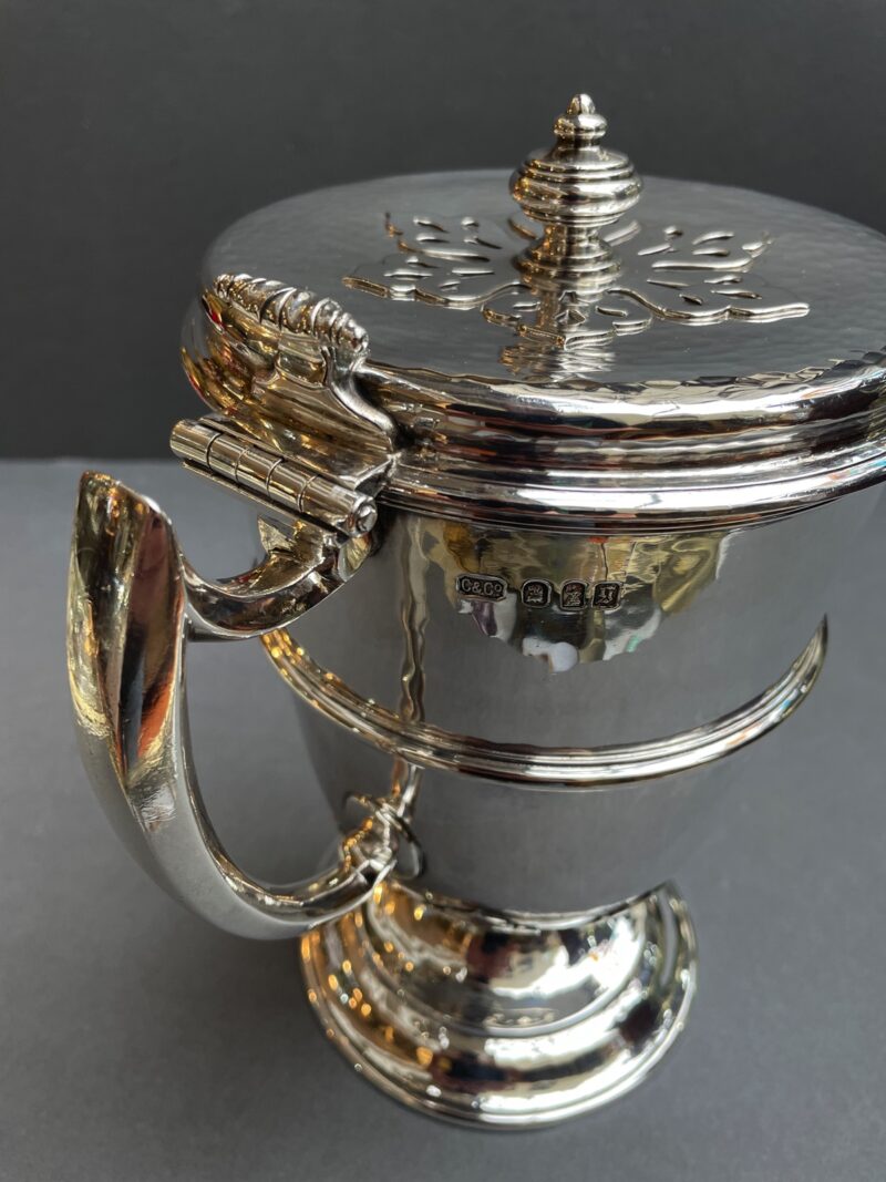 A museum quality Britannia Silver covered cup (or stein) with decorative handle and hinged lid and small spout for serving beer or wine. The body is entirely hammered and the lid has an English Arts & Crafts design. The piece is stamped with English Britannia silver hallmarks – meaning the quality of Britiannia silver is .958 (as opposed to Sterling silver is .925). The piece is quite thick and heavy and is of exceptional quality.