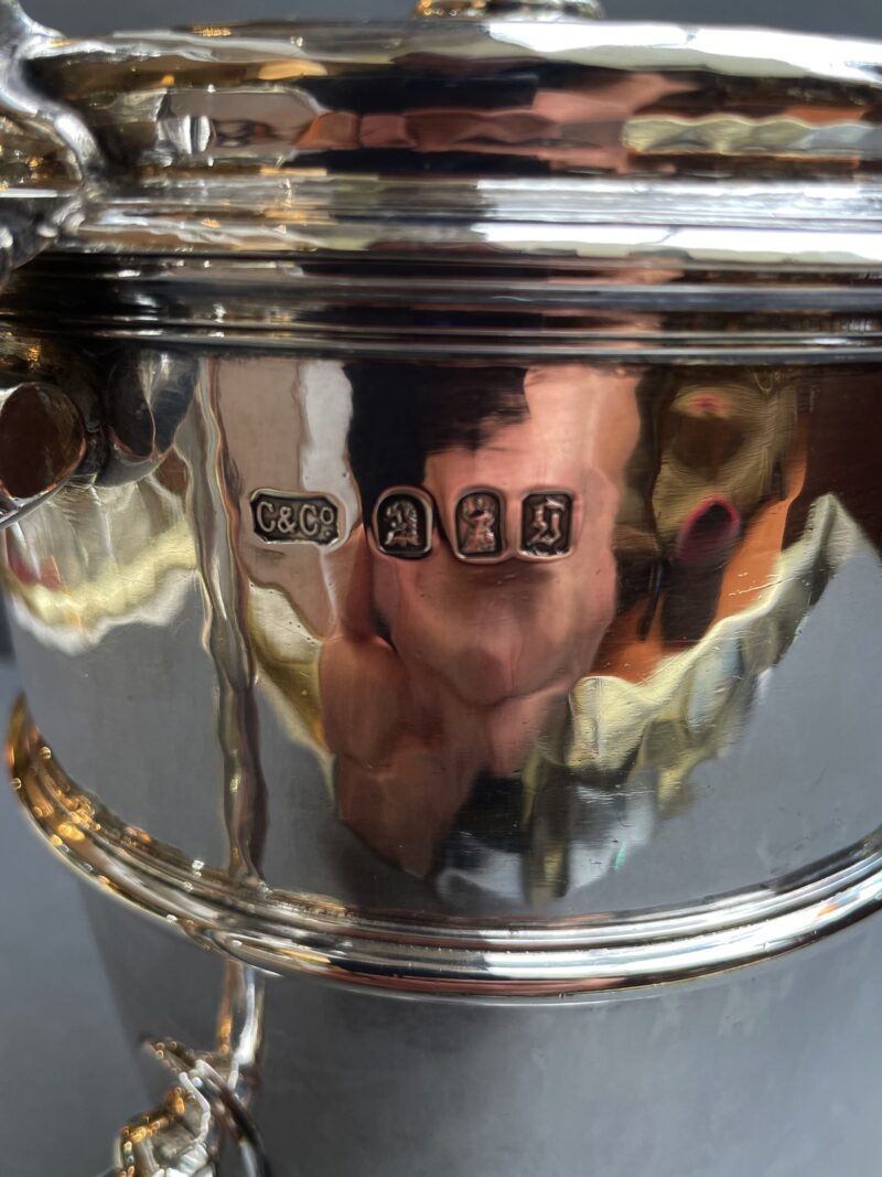 Silver HollowareMuseum Quality English Britannia Hallmarked Silver (.958) Large Lidded Beer / Wine Jug – by Carrington & Co – dated 1922 – English Arts & Crafts Design.