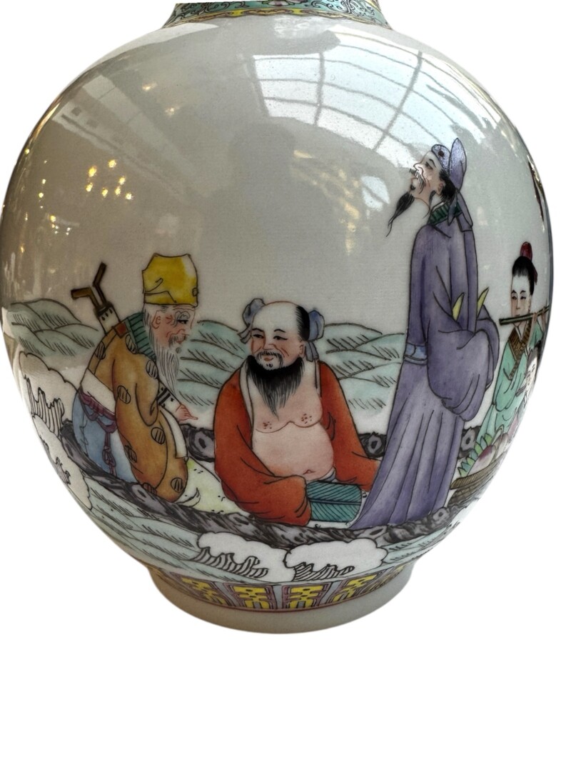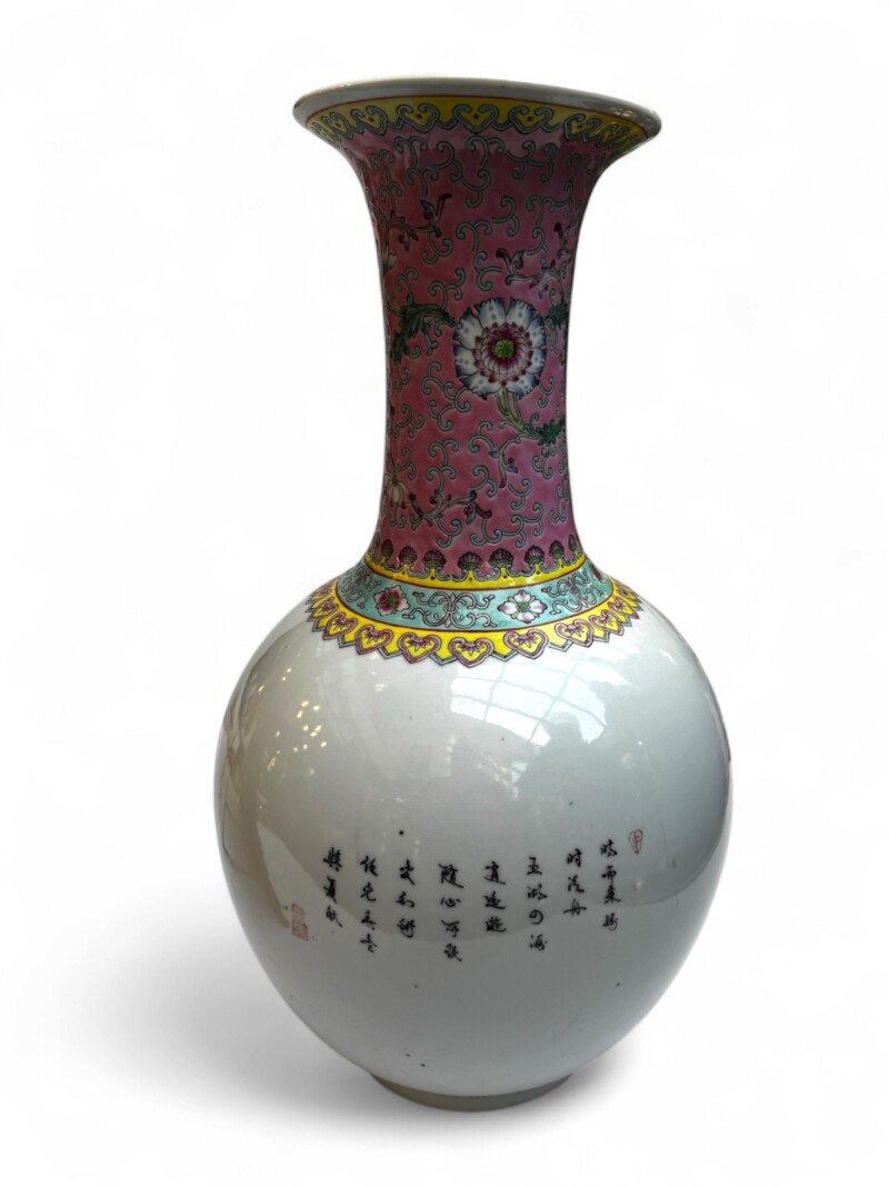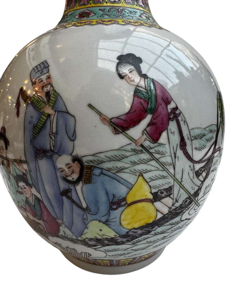 Fabulous and large this is a Chinese ‘famille rose’ vase decorated with a mythological story of “Eight Immortals Crossing an Ocean”. Famille rose, is a group of Chinese porcelain wares characterized by decoration painted in opaque overglaze rose colours, chiefly shades of pink and carmine. These colours were known to the Chinese as yangcai (“foreign colours”) because they were first introduced from Europe (about 1685).