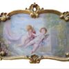A whimsical oil painting on canvas of flying ‘Cherubs in the Garden’ scene – in soft pastel colours of pinks and greens and blues, framed in a burnished gold wood and gesso frame of an unique shape. Beautiful condition.