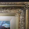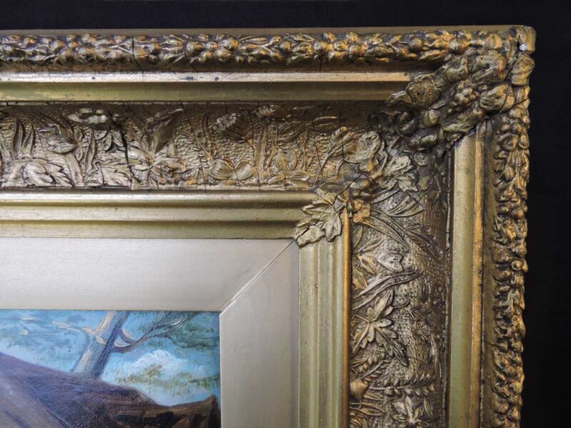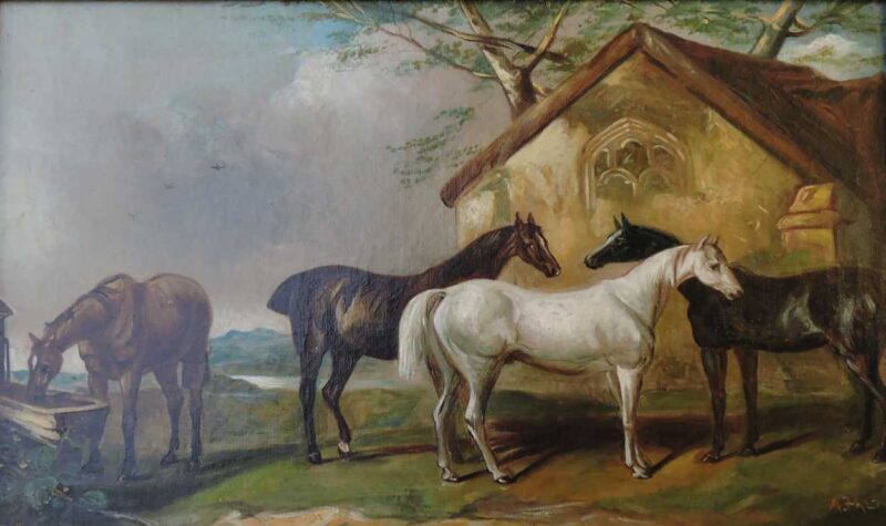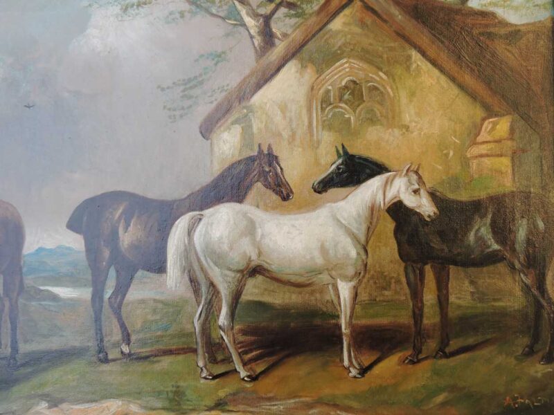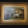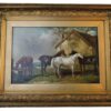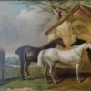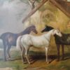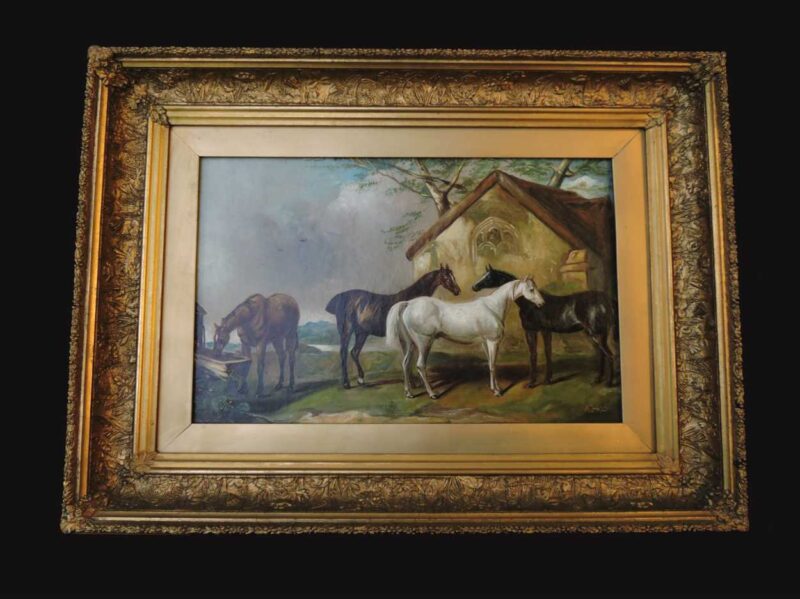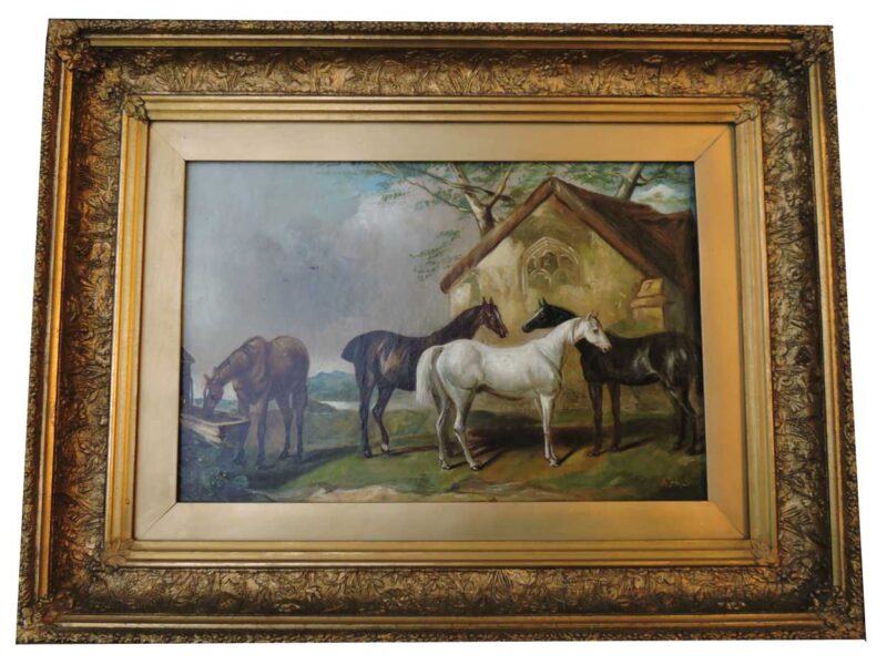 A delightful 19th century oil painting on canvas – with a scene of 4 horses standing near a barn.  Framed in a large gilt wood frame makes the paintings colours stand out.  A wonderful rural English painting that can be displayed anywhere.