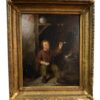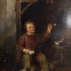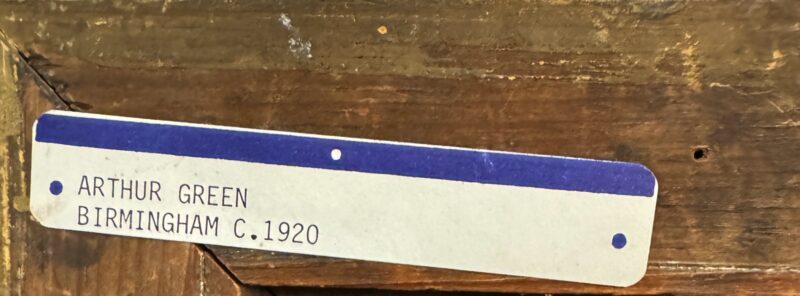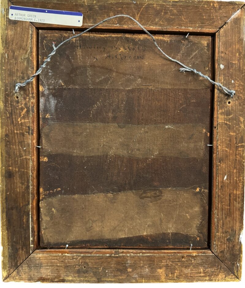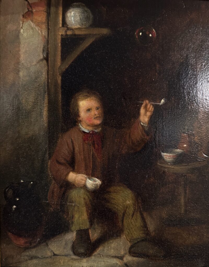 A whimsical painting of a boy sitting on the floor blowing bubbles in an interior room with a table beside him and a shelf above his head .  The painting is painted on wood panel and is signed on the reverse A. Green – Blowing Bubbles with a label Arthur Green Birmingham circa 1920.