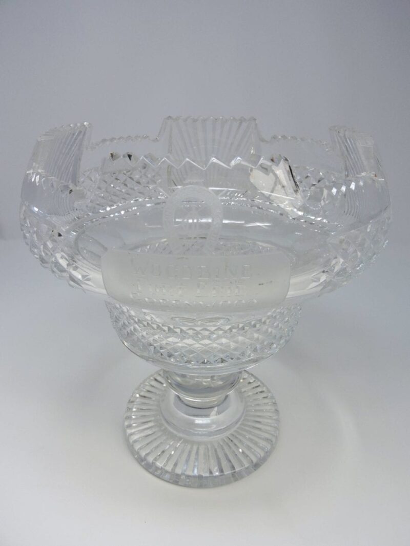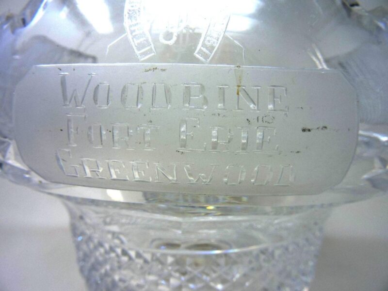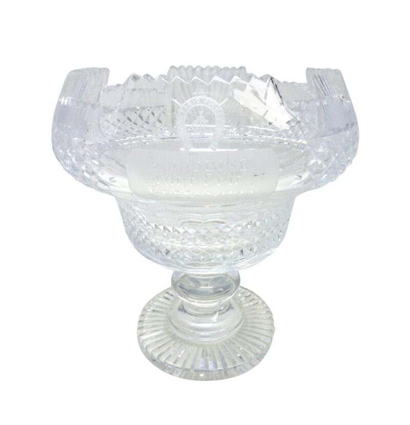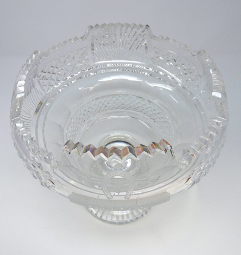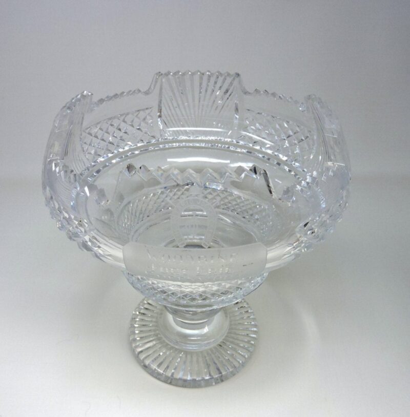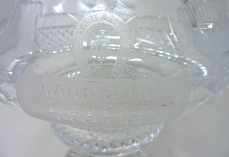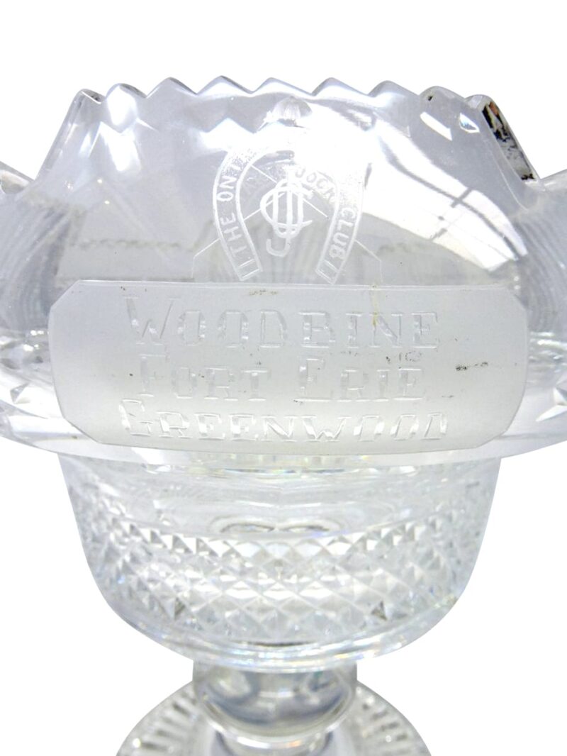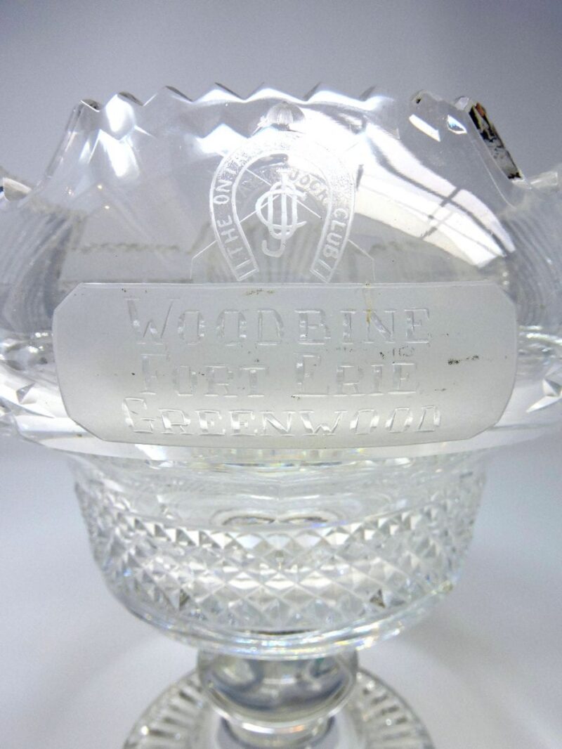 A gorgeous Irish cut crystal pedestal bowl, signed Waterford. The Large bowl has a presentation engraving “Ontario Jockey Club Woodbine, Fort Erie and Greenwood” on the front (see photo) and a pedestal base.