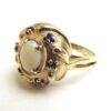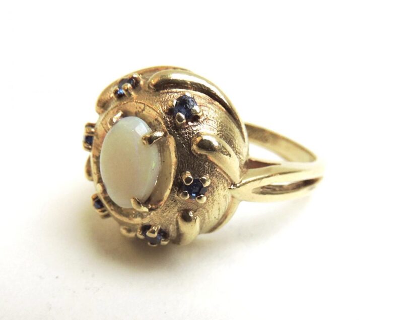 18 karat yellow gold ring with one cabochon cut, white opal (set in 4 claws)  and 6 synthetic round sapphires – claw set.