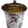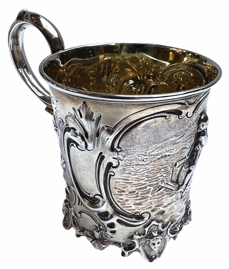 A sumptuously ornate sterling silver cup with an interior gold wash and outer surround of figural relief of man rowing a raft to a “palm tree” shore landscape, made by William Ker Reid, London 1851.