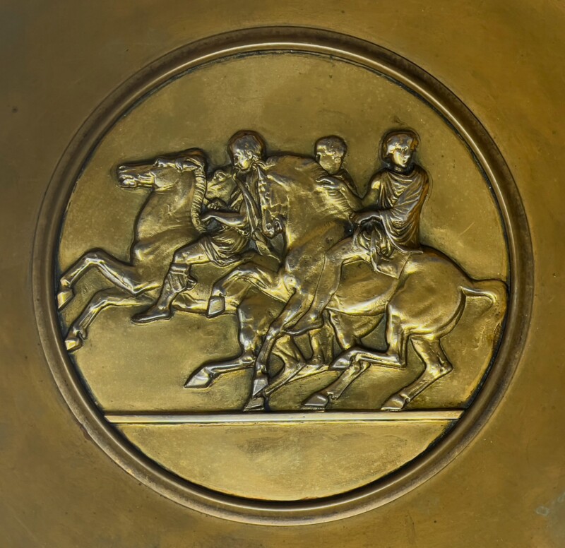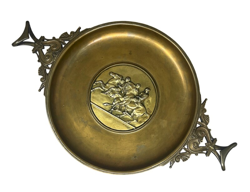 Art, GeneralA glorious Roman-classical style decorative bowl, cast in bronze. This antique coupe is signed by Ferdinand Barbedienne (France, 1810-1892). In the center a circular relief of horse riders from the classical Roman era surrounded by a contrastingly smooth rim of bronze and two beautifully curved and scroll decorated handles. The bottom is amazing in the level of decoration featuring fine scrolls and heads of the god Bacchus. Made in France, 1870-1880.