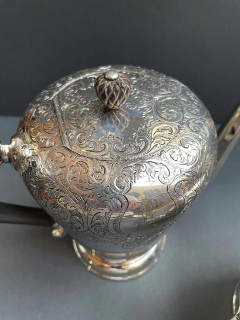 v** SOLD ARCHIVES **vA beautiful engraved sterling silver coffee pot. This piece is English hallmarked for Birmingham 1902 and have carved, ebony handle and pineapple finial. Beautifully engraved on the lid, upper half of the bodywith a plain lower half. The underside of the piece shows the maker’s mark as well as the hallmarks.
