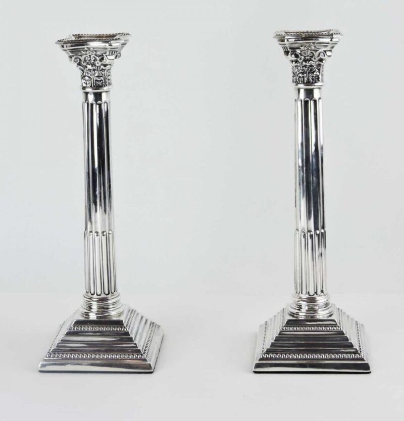 v** SOLD ARCHIVES **vA Pair of English Hallmarked Sterling Column Candle Holders. Birmingham, Dated 1936.