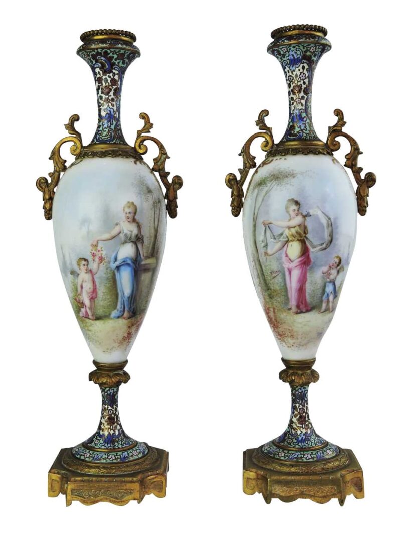 v** SOLD ARCHIVES **vA charming pair of Sevres styled porcelain vases with delightful figural scenes of a fair maiden and cherub in a forest with a basket of flowers, signed by artist P. Roche, it dates circa 1860, France. It features an ovoid shaped porcelain body, hand-painted in colours of teal, violet, blue, yellow, pink, brown and green, and decorated with embellishments of foliate and gold throughout, with a metal beaded rim, curved metal handles and metal foot. Beautifully designed and painted, it would be perfect for a unique gift, or a collector of fine art objects.