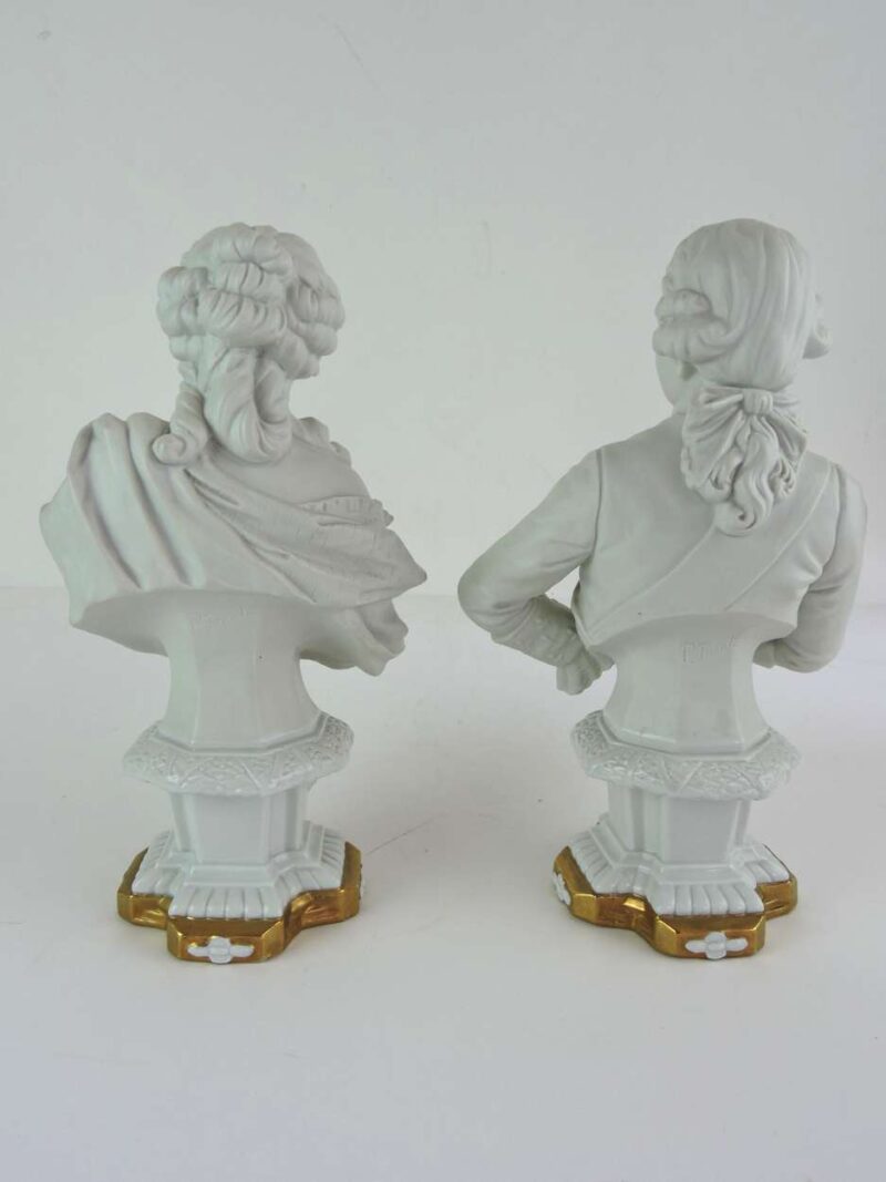A pair of large busts on pedestals in porcelain portraying portraits of classical figures by KPM, Made in Germany. The female figure is dressed with an elegant ruffled gown with arm weighting across her chest. The male figure wears a wig in fine clothes, with a slash and maltese cross, he has one hand hidden in his waist coat. Each portrait has gestures of bourgeois characteristics with dress attire, pose and wig in a classical style.