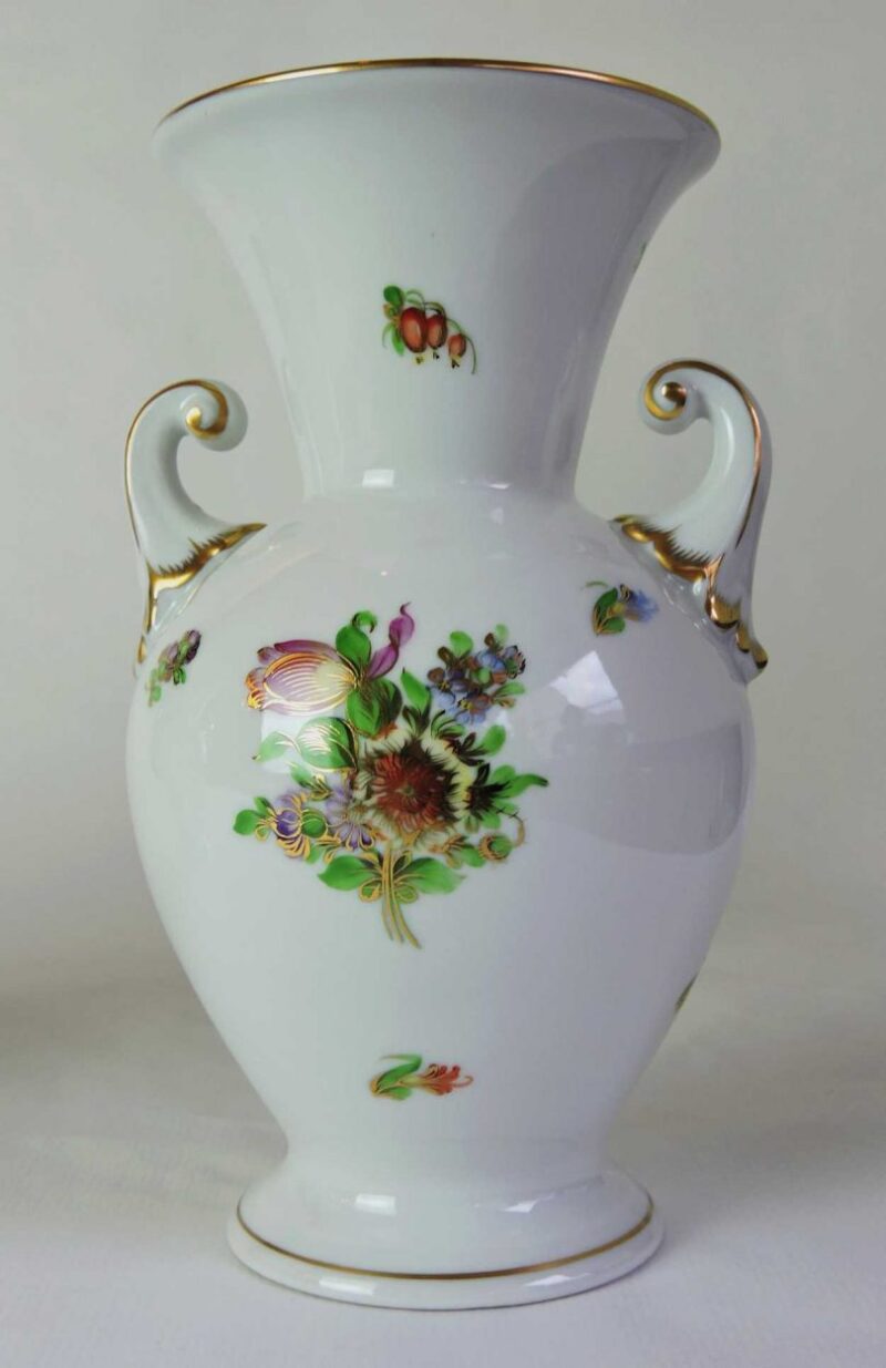 v** SOLD ARCHIVES **vA lovely pair of Herend porcelain vases with hand painted flower pattern, its dates 20th century, Hungary. Each vase features a unique hydria vase shape, with a large bouquet on the rear and front in the centre, with small accents of flowers throughout, in colours of red, green, yellow, orange, blue and green with gold trim on white. It is beautifully handcrafted and designed, perfect for a gift, or for a nostalgic collector.