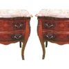 A pair of Italian inlaid and marble top bedside commodes in the French style with bronze mounted hardware and bombay shape.
