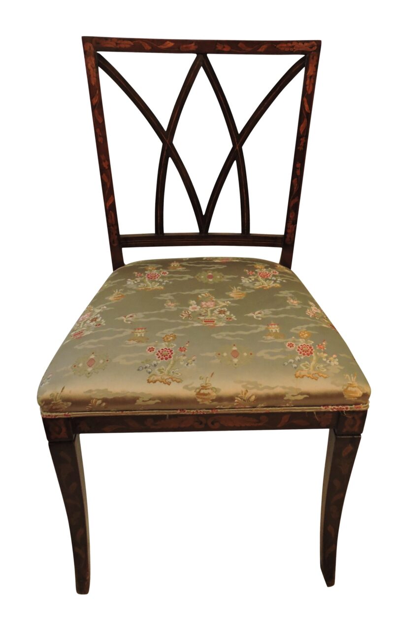Pair of 19th Century Dutch Marquetry Side Chairs, Inlaid Satinwood Decorations, Grey Chinoiserie Silk Seat Coverings