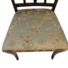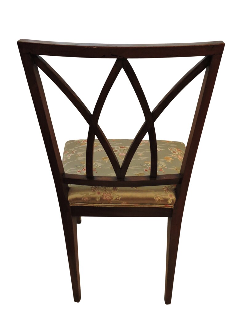 A beautiful pair of 19th century Dutch marquetry chairs with curved backs and inlaid satinwood decoration on the frame and legs. Each chair has a chinoiserie floral patterned grey silk covering on the seat.