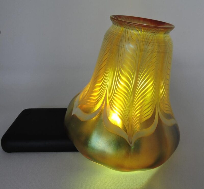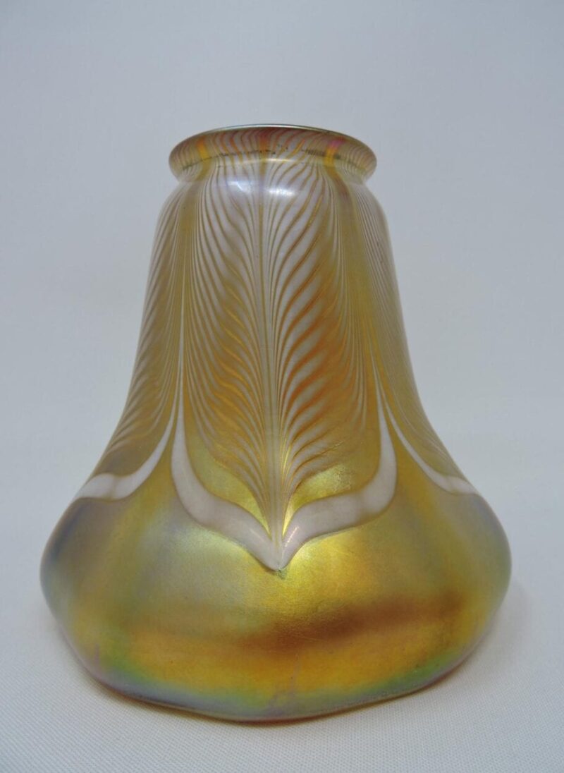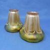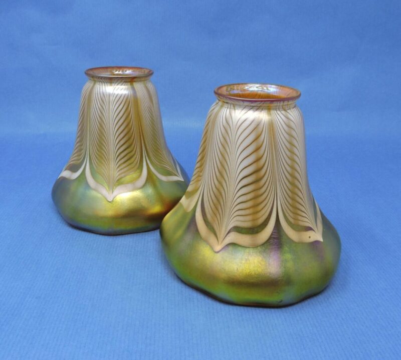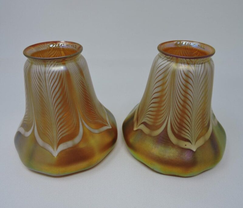 Pair of American Quezal Iridescent Art Glass Shades Feather Pulled