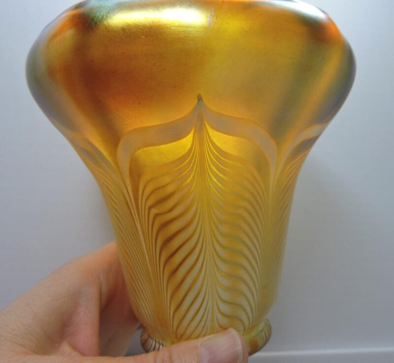 Pair of American Quezal Art Glass Shades Feather Pulled Iridescent