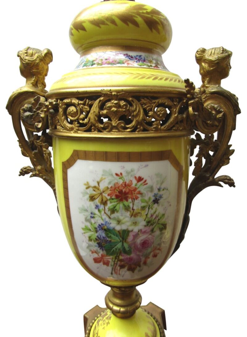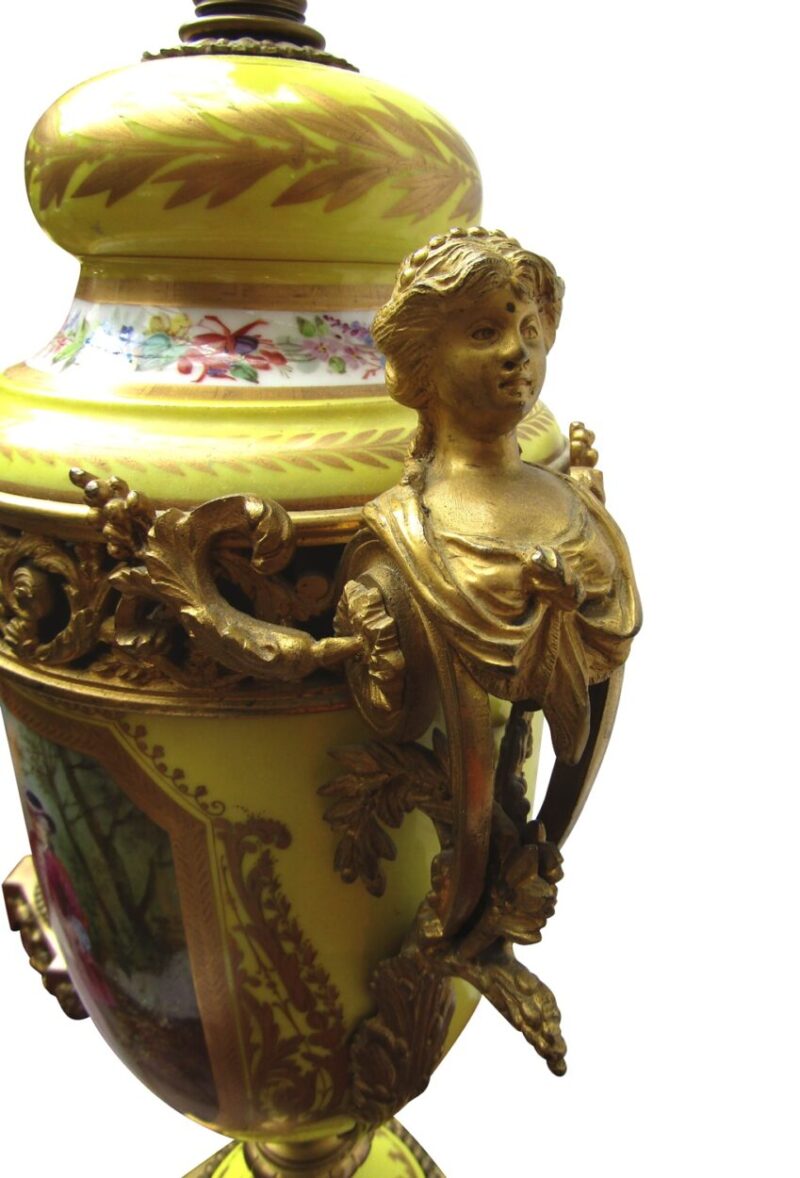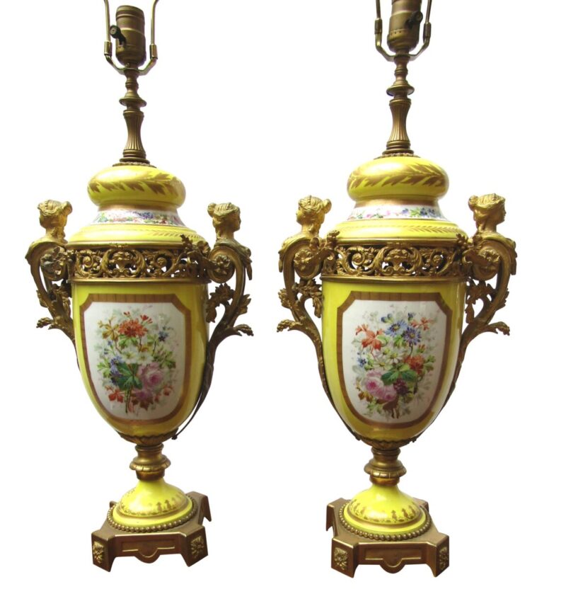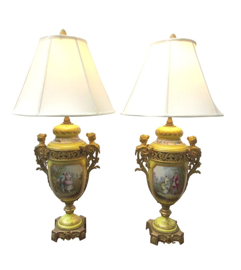 A beautiful quality pair of yellow porcelain ‘Sevres’ table lamps with shades and acorn finials.  The lamps have bronze fittings and bronze bases with “handles” of women figures. The porcelain lamp bodies are decorated with hand painted panels of figures on the front and sprays of flowers on the back sides. The lamps are lavishly accented with burnished gold leaves.