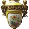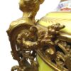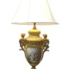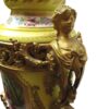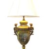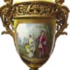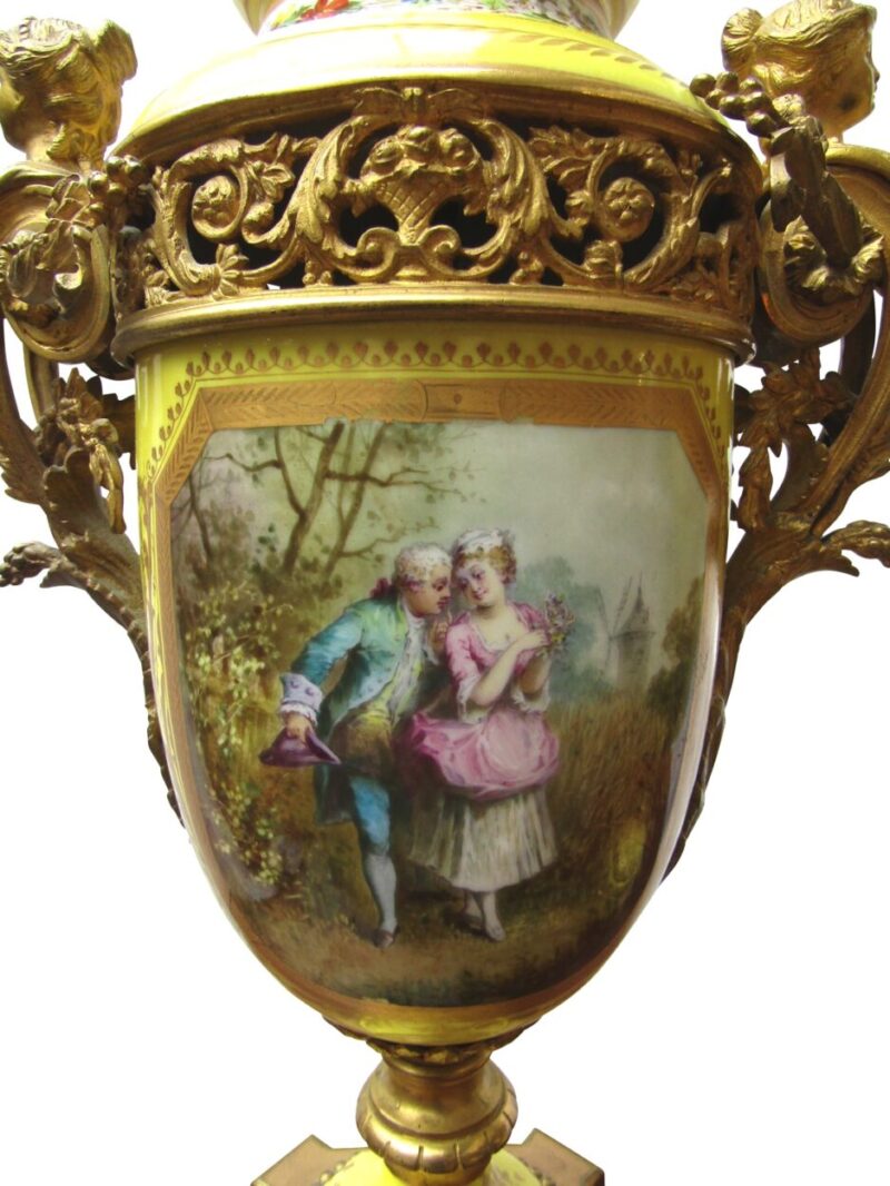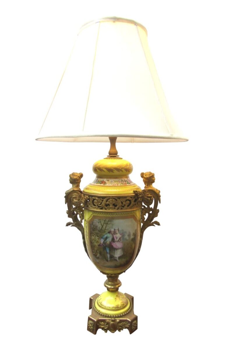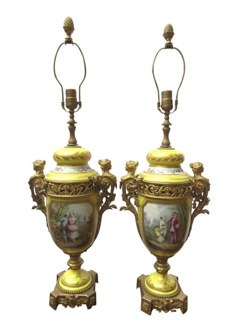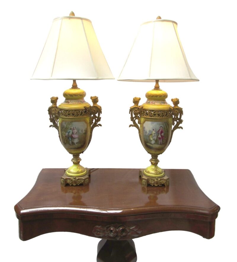 A beautiful quality pair of yellow porcelain ‘Sevres’ table lamps with shades and acorn finials.  The lamps have bronze fittings and bronze bases with “handles” of women figures. The porcelain lamp bodies are decorated with hand painted panels of figures on the front and sprays of flowers on the back sides. The lamps are lavishly accented with burnished gold leaves.