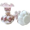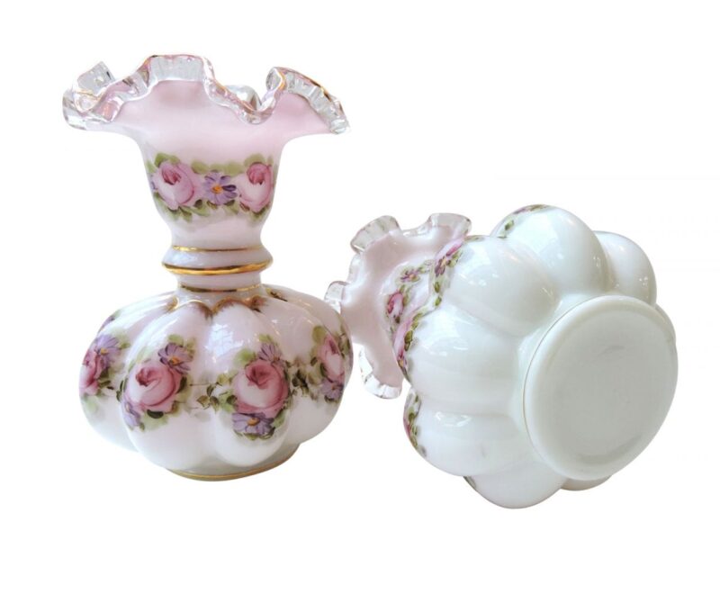 The vases have a pink interior and white exterior with ruffled rims. The body of the vases is decorated with pink roses and small purple flowers with green accents and gold trim.