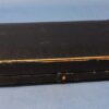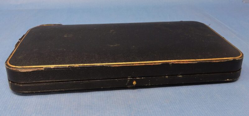 The spoons are housed in a black leather box with blue silk on one side and blue felt on the other, decorated with blue silk edging.