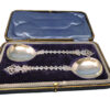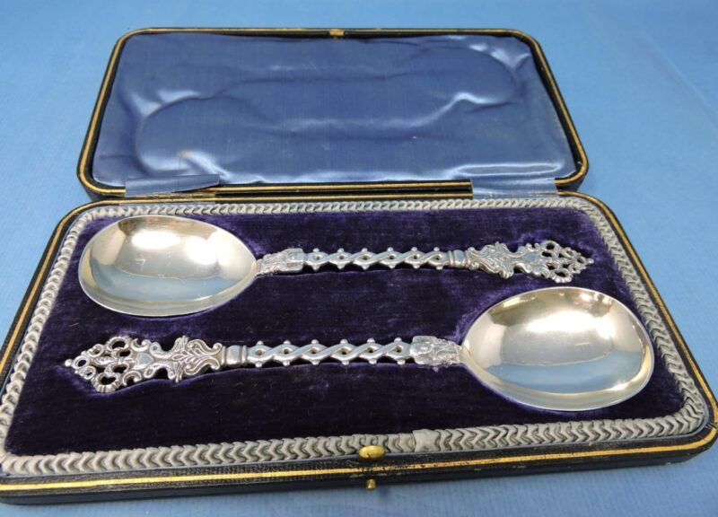 Pair of English Hallmarked (Sheffield 1910) Sterling Silver Gothic Revival Spoons, Maker J. Rogers & Sons, Original Box