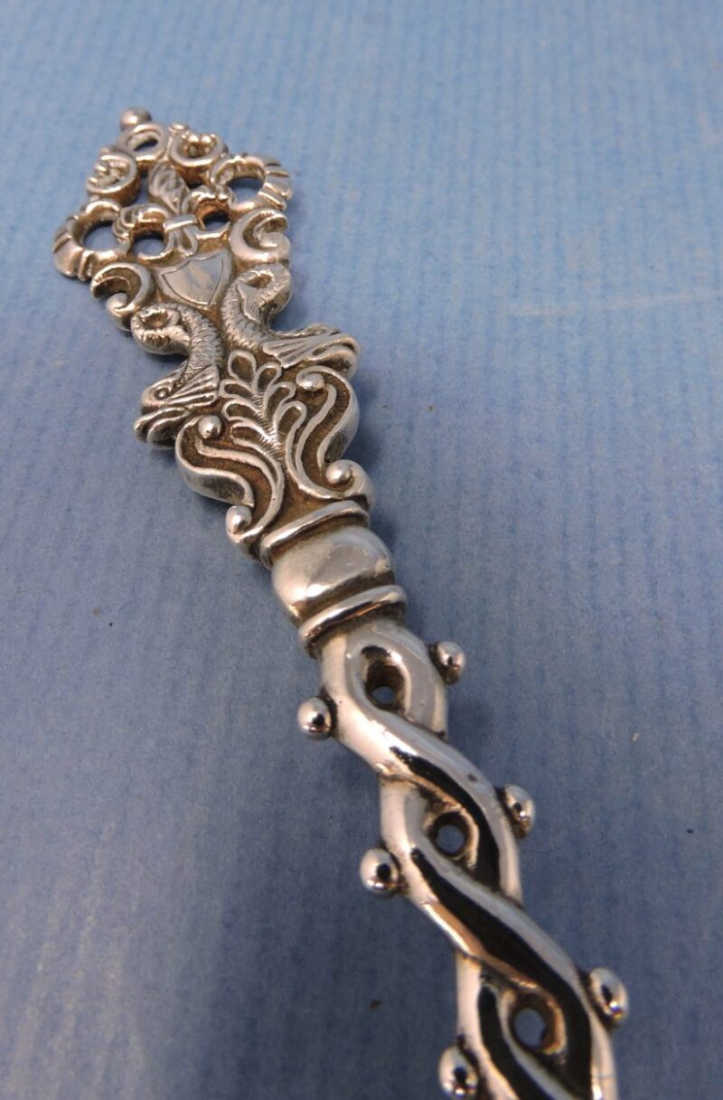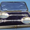 Silver Serving PiecesA pair of English hallmarked (Sheffield 1910) gothic revival spoons in their original presentation box. The maker is John Rogers & Sons. The handles of the spoons are elaborately decorated.