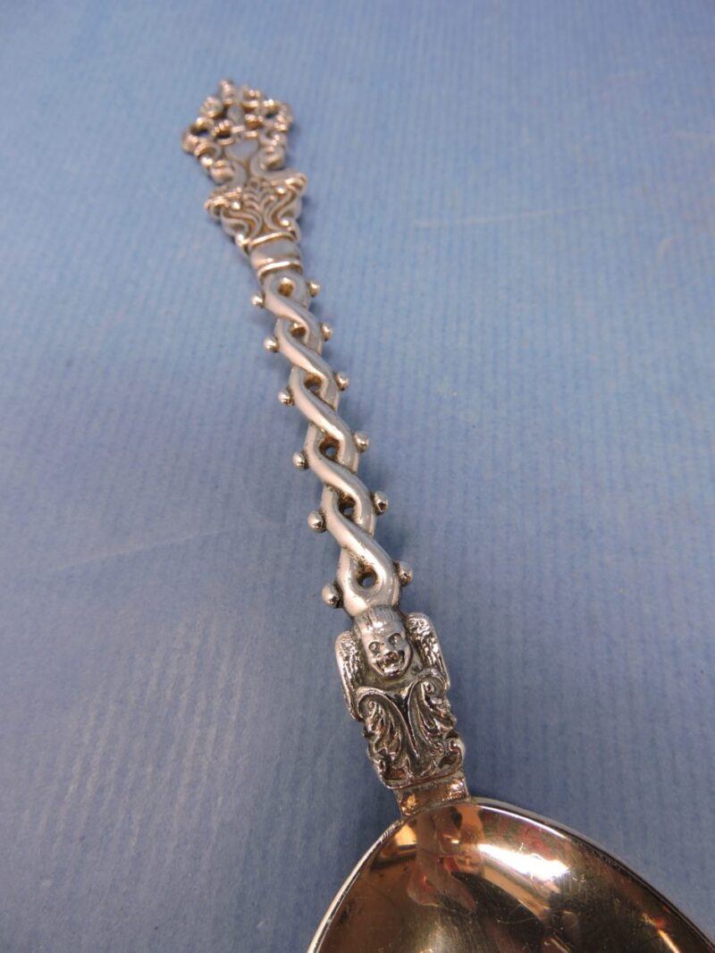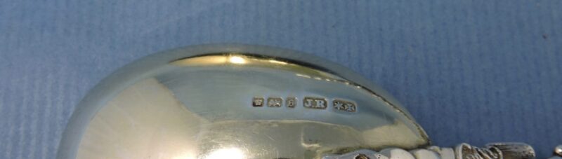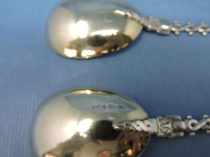 Each spoon has English Sterling hallmarks on underside of the bowl and has a gold wash on the interior and underside of the bowl of the spoon.