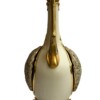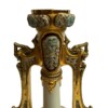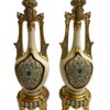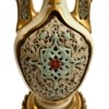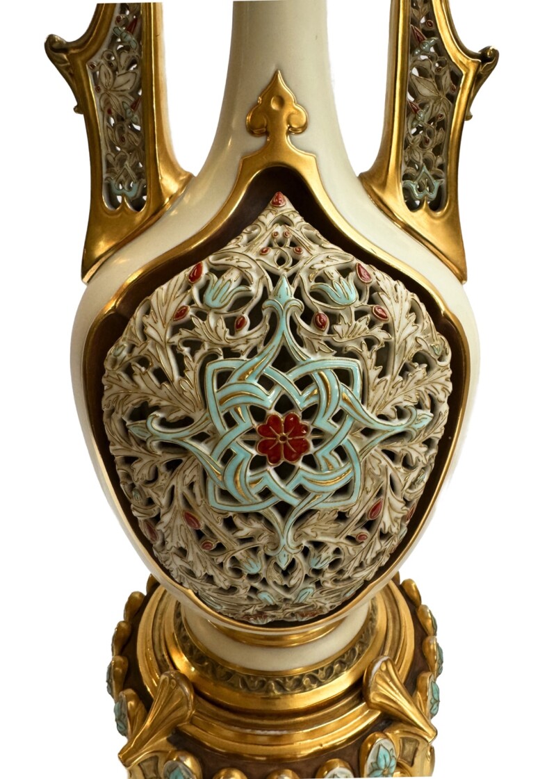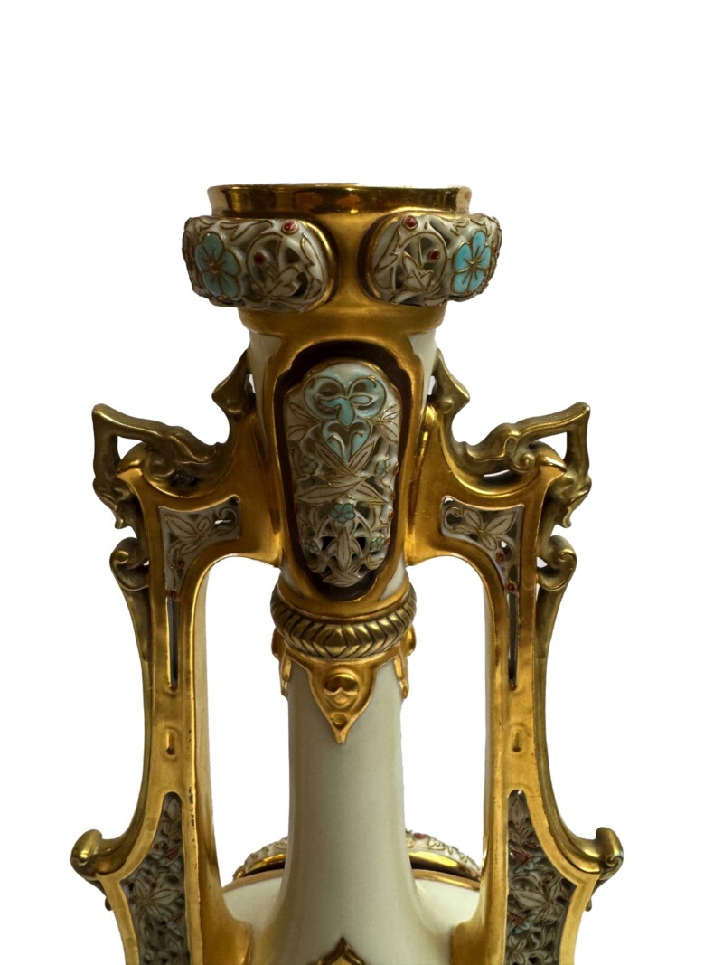 PorcelainsAn exquisite pair of Royal Worcester porcelain vases in a “Persian” style with tall narrow necks, long handles, bulbous bodies with are pierced on both sides. The vases sit on four footed stands. The creamware background is highlighted with gold and the bodies and upper parts of the vases are enamelled in a turquoise blue with red highlighted dots and flowers.