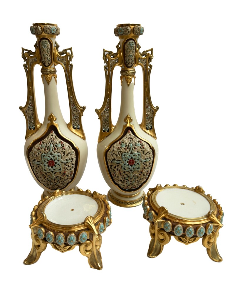 Pair of Exquisite Royal Worcester “Persian” Vases and Stands – dated 1883