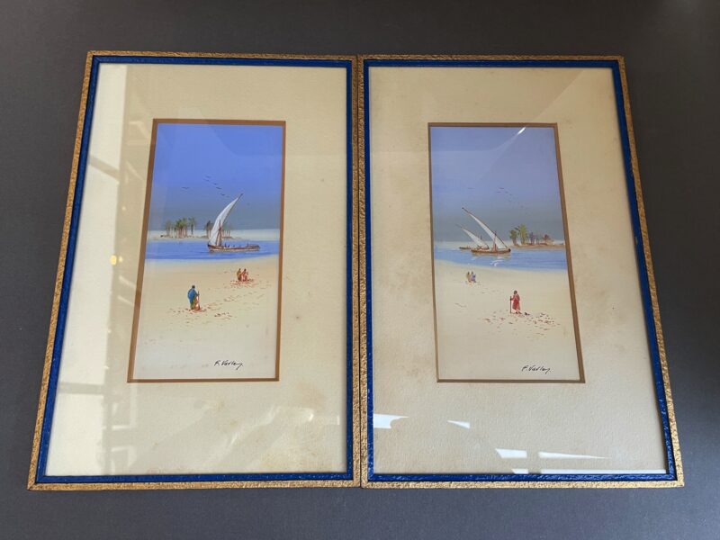 v** SOLD ARCHIVES **vA wonderful pair of framed and matted orientalist scene watercolours by the Canadian artist, Frederick Valley (1884-2016). Mr Varley was one of the founding members of the Group of Seven artists in 1920. The paintings depict figures in Arab dress standing on sand in front of water and an island with a boat in front of the palm trees.