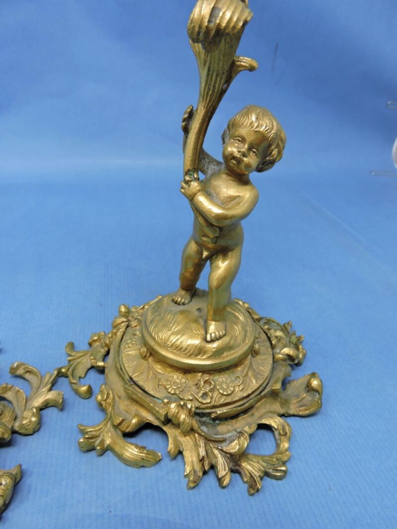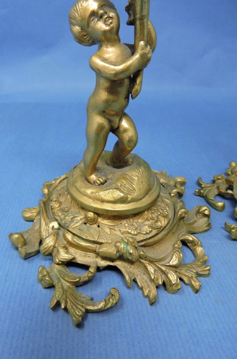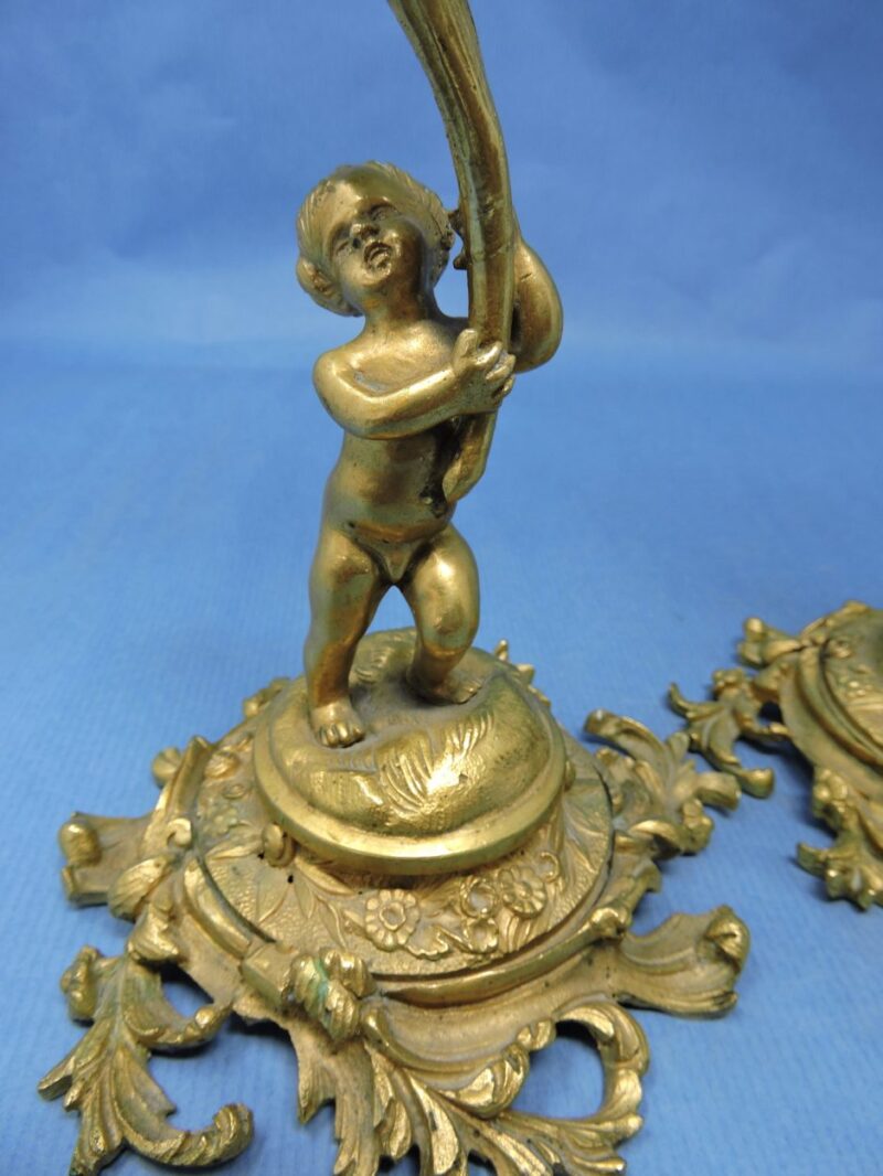 A gorgeous pair of French, gilt bronze candlesticks with elaborate decoration and putti figures, dated circa 1860.