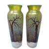 Pair of French Enamelled Iridescent Art Glass Vases – Winter Scenes, Unsigned – Most Likely Legras – 12 3/4 Inches Tall