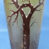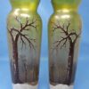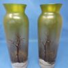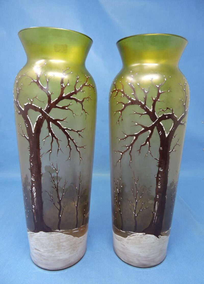 Here is a gorgeous pair of iridescent green / brown French art glass vases (probably LeGras but unsigned), each 12 3/4 inches tall, decorated in enamel, showing a winter scene with snow banks and snow-covered trees.