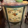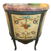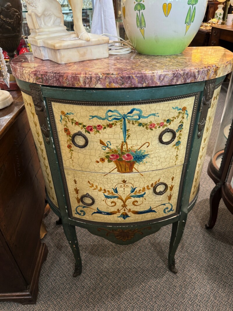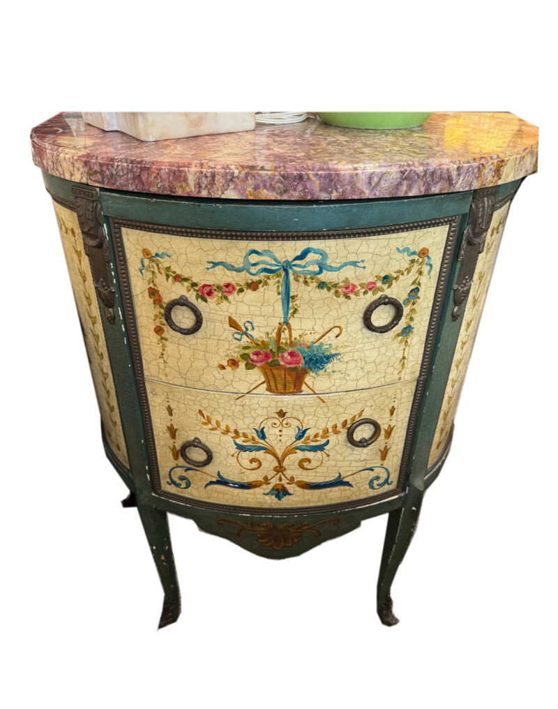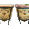 Pair of French Hand Painted Wood and Marble Top Demi Lune Cabinets