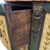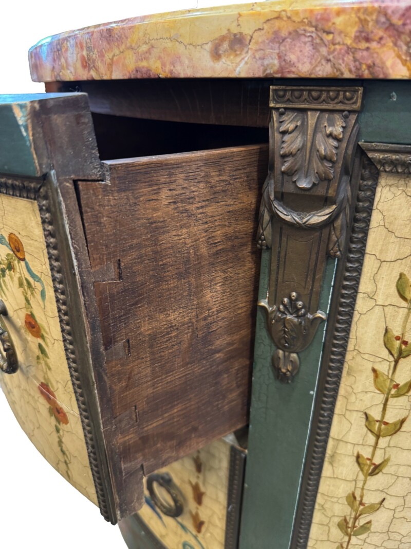 This wonderful pair of French, circa 1910, demi lune (half moon) cabinets each featuring two drawers, perfect proportions and lovely hand painting. The two “sans travers” drawers on the front have antique circular bronze handles, and oak tongue and groove construction. All surfaces are hand painted with bronze trim elements and rests on four tapered legs. Each cabinet has luxuriously veined Italian marble tops featuring a beautiful grain and gorgeous soft colours including different shades of pink, yellow ochre, and sienna browns. Very unique and in great condition considering their age and use.