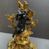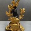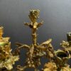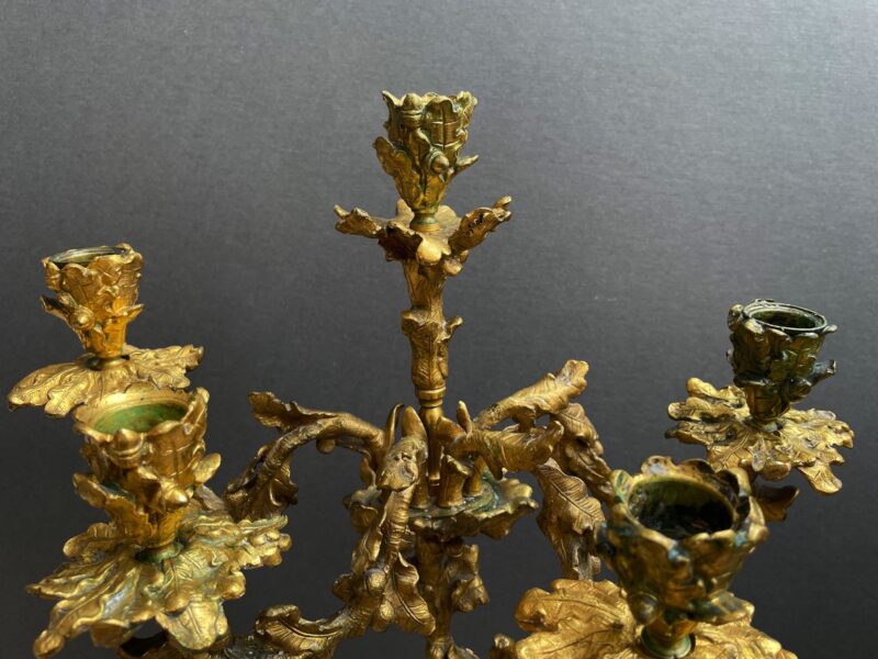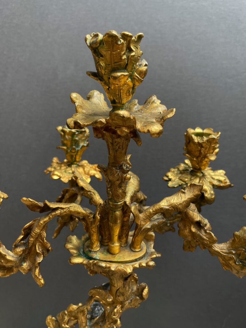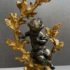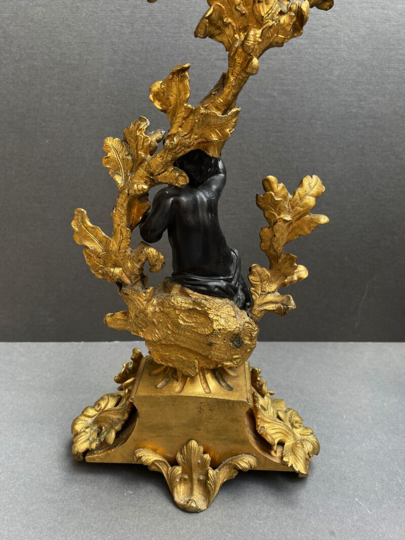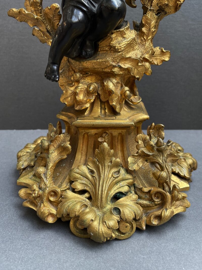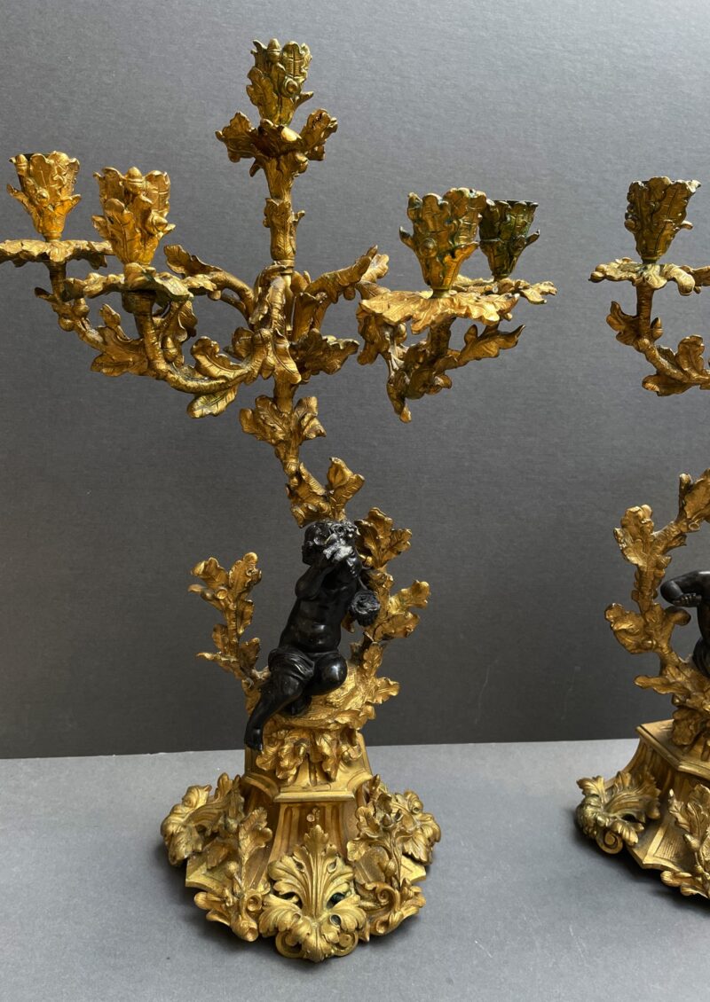 A beautiful quality pair of Rococo gilt bronze candelabras with black patina’d bronze putti figures sitting perched among the branches of the tree trunk bodies.  The solid bases are adorned with gilt oak leaves and acorns.  The black patina of the putti stands out from the gilt of the candelabras.  Very nice quality.