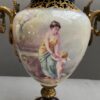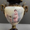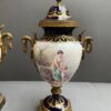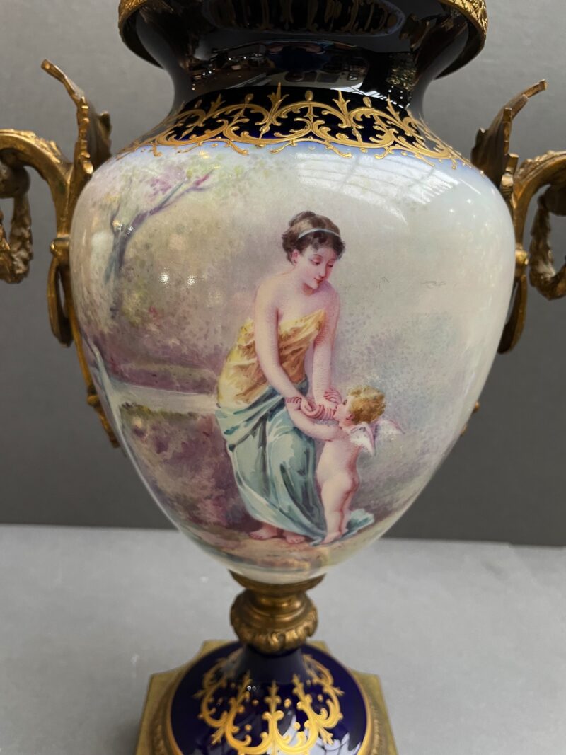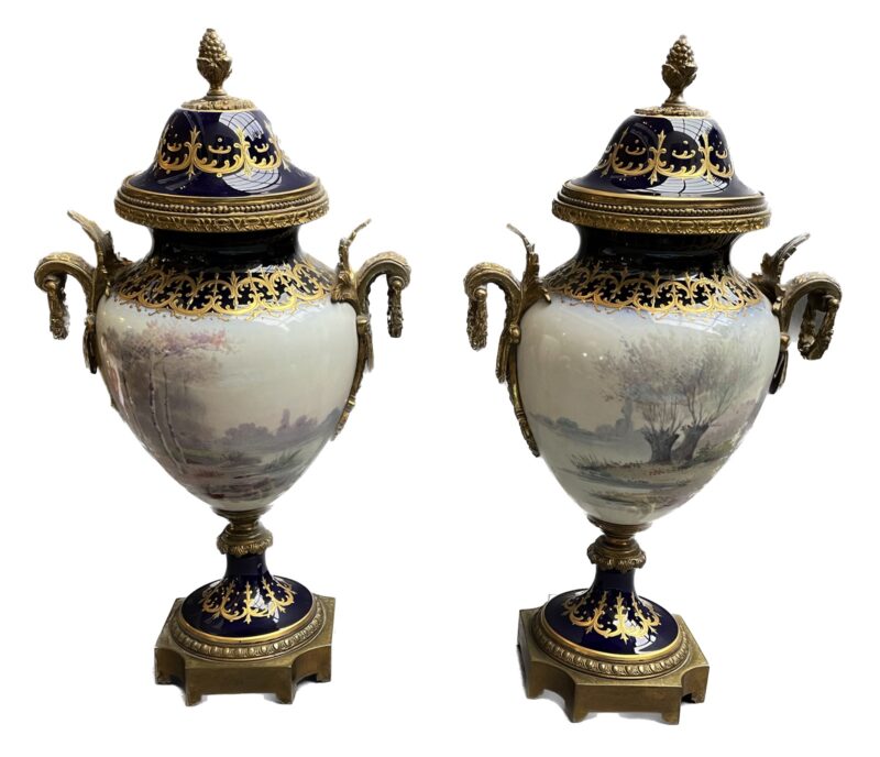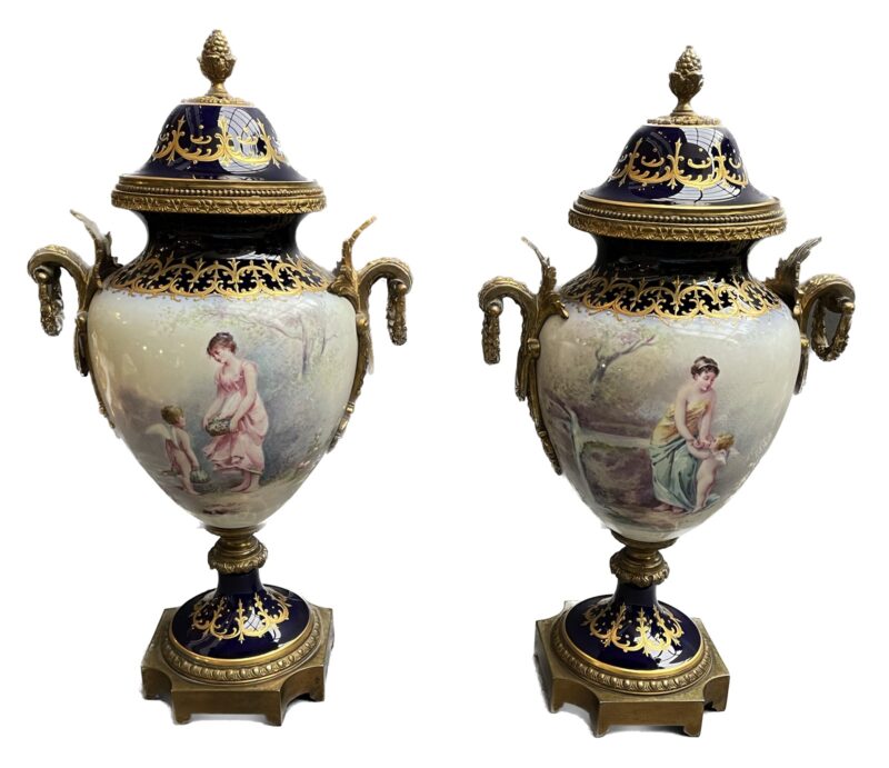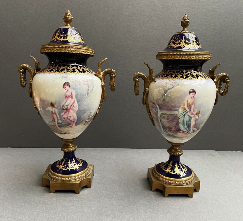 v** SOLD ARCHIVES **vA beautiful pair of French Sevres porcelain hand painted vases with removable lids with acorn finials and bronze ormolu mounts, handles and footed bases, dated 1841. The vase bodies have a white background, painted on one side with figures of women and putti, while the other side shows scenes of trees and landscapes. They are each signed “C. Velly”. The bottom and top sections of the vases as well as the lids are painted cobalt blue and wonderfully decorated with gilt swirls and designs.