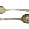The spoons have a gilt wash and are richly decorated in florals and swirl patterns. The underside of each spoon shows the full set of hallmarks.