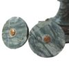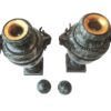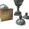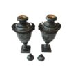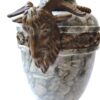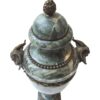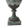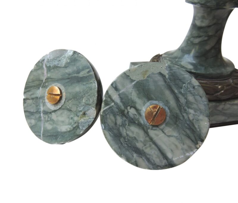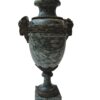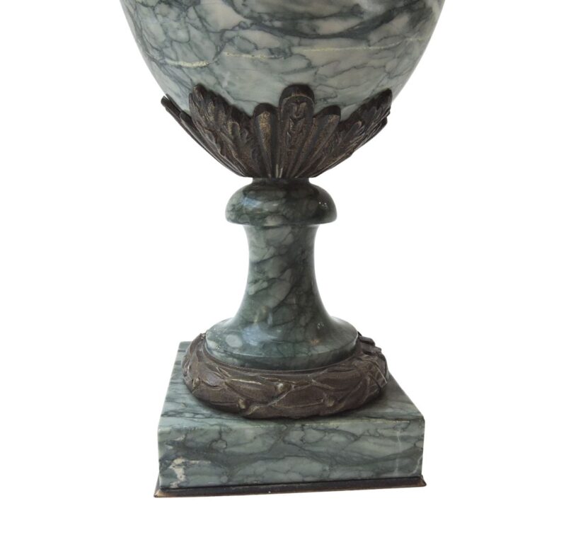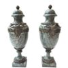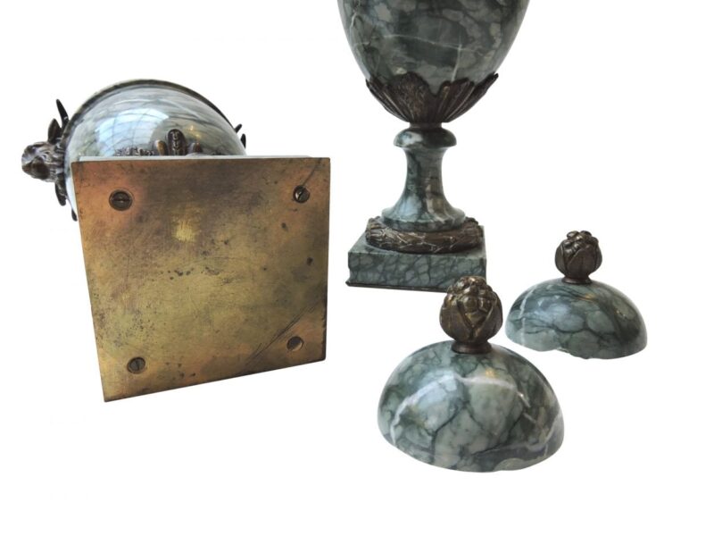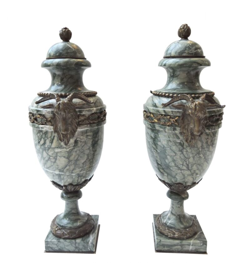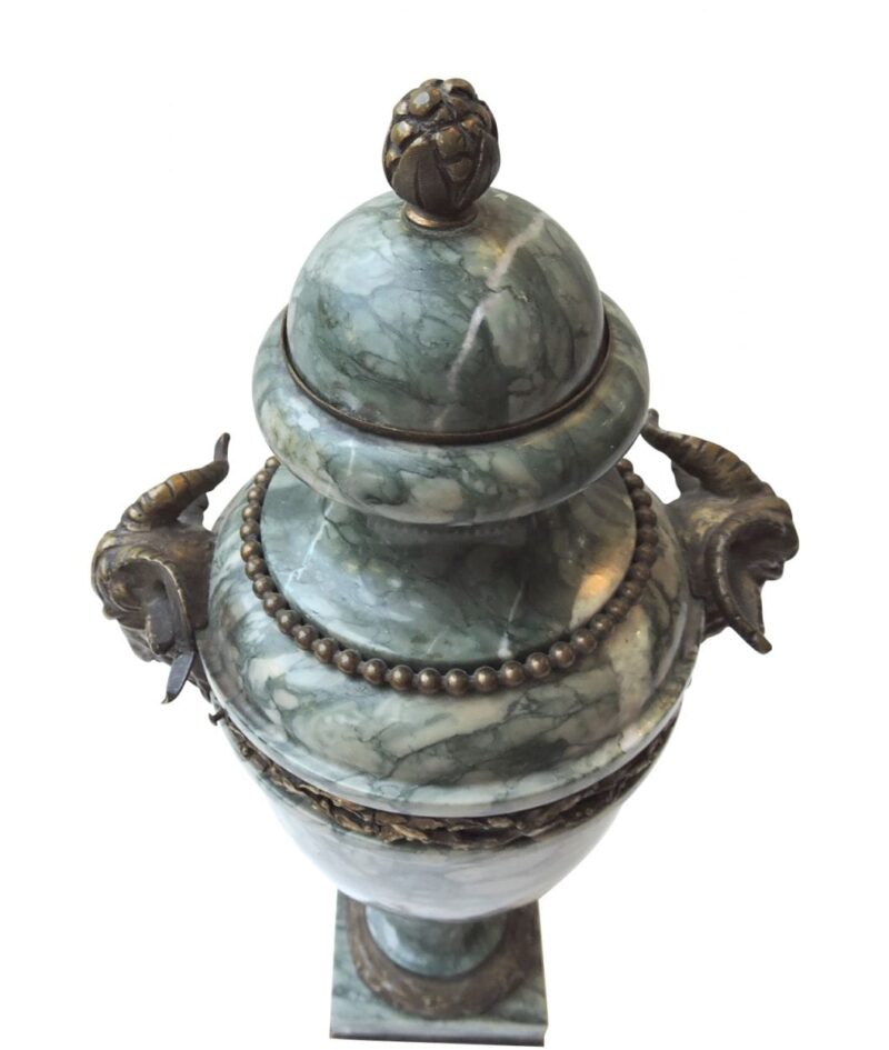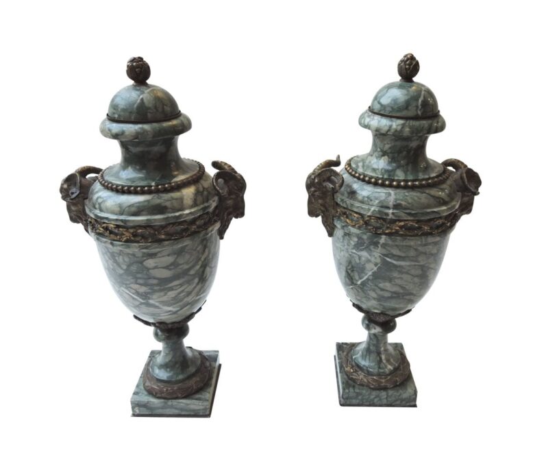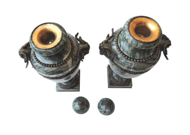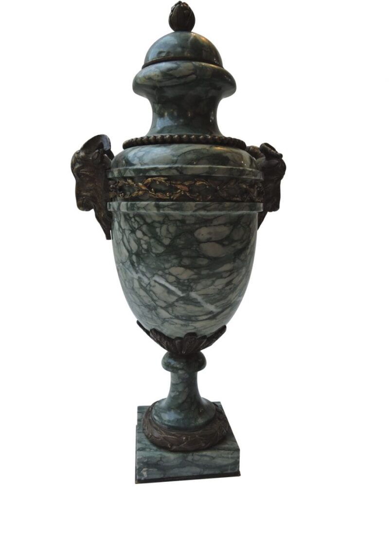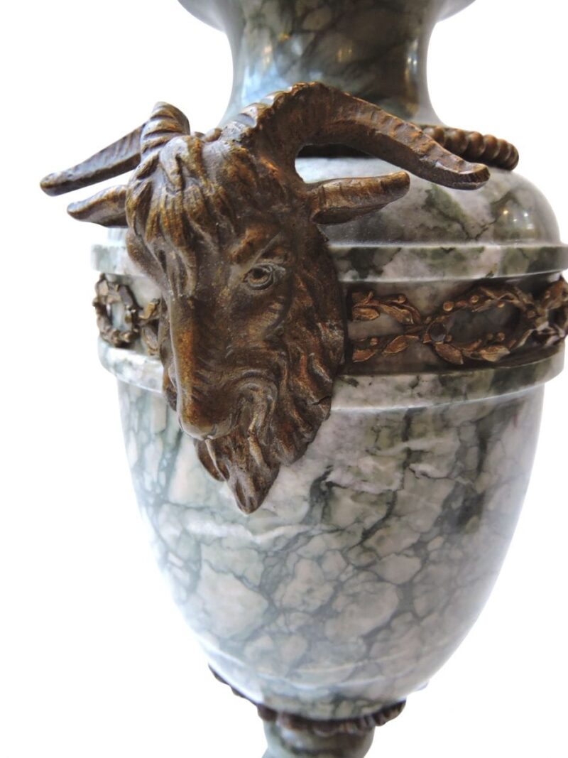 A lovely pair of decorative heavily veined green marble urns with bronze rams head mounts to each side and bronze trim, with bronze finials – dates circa 1900.