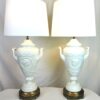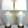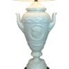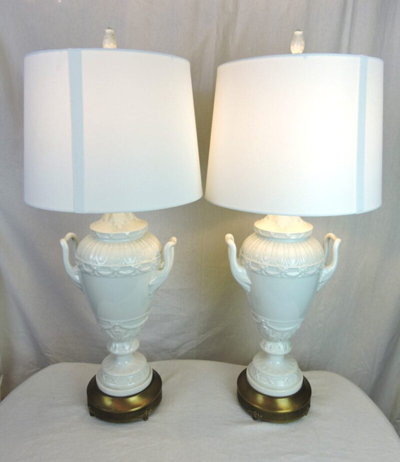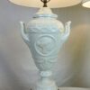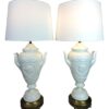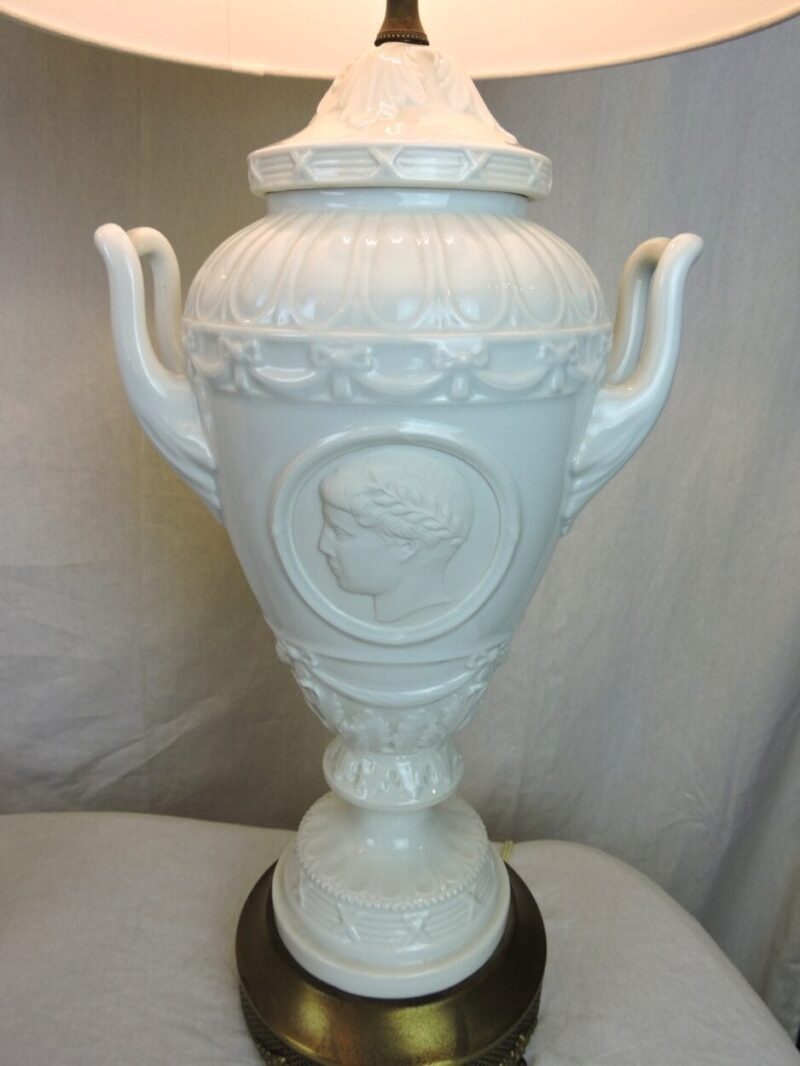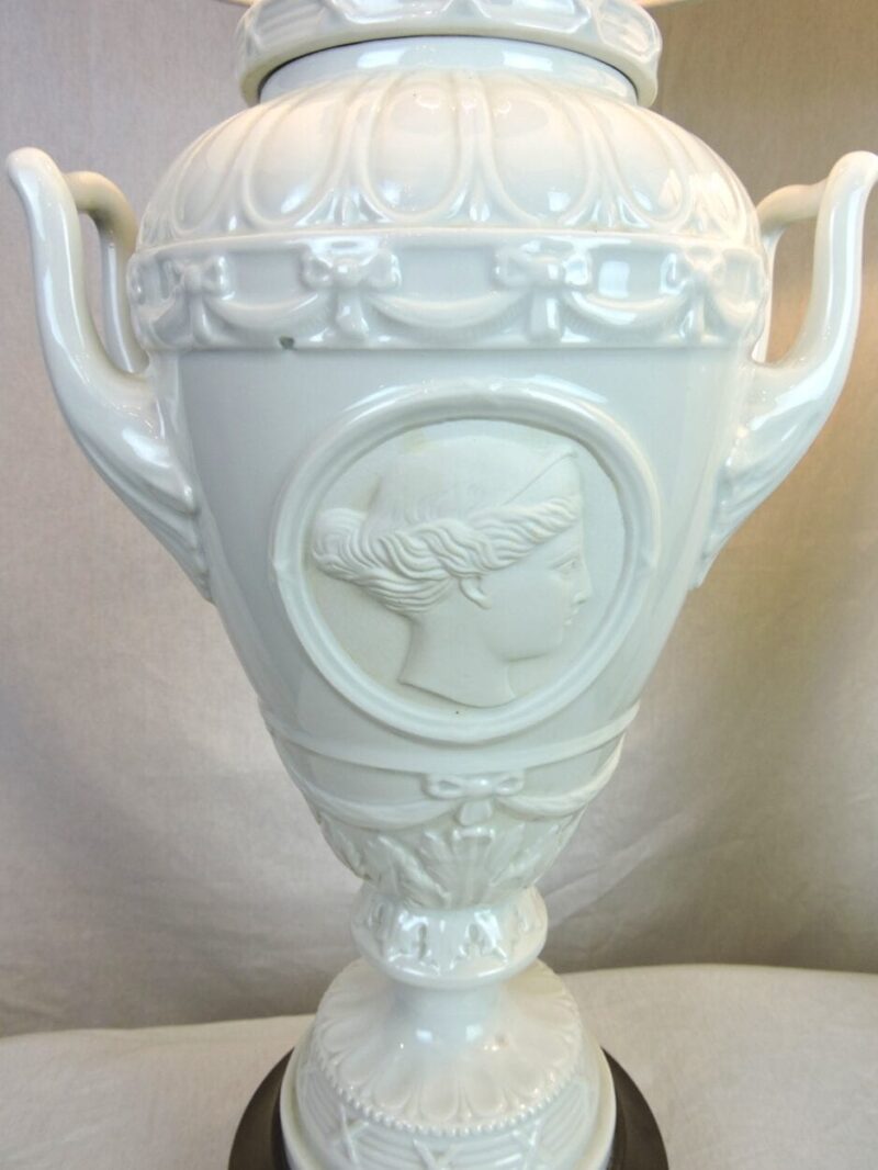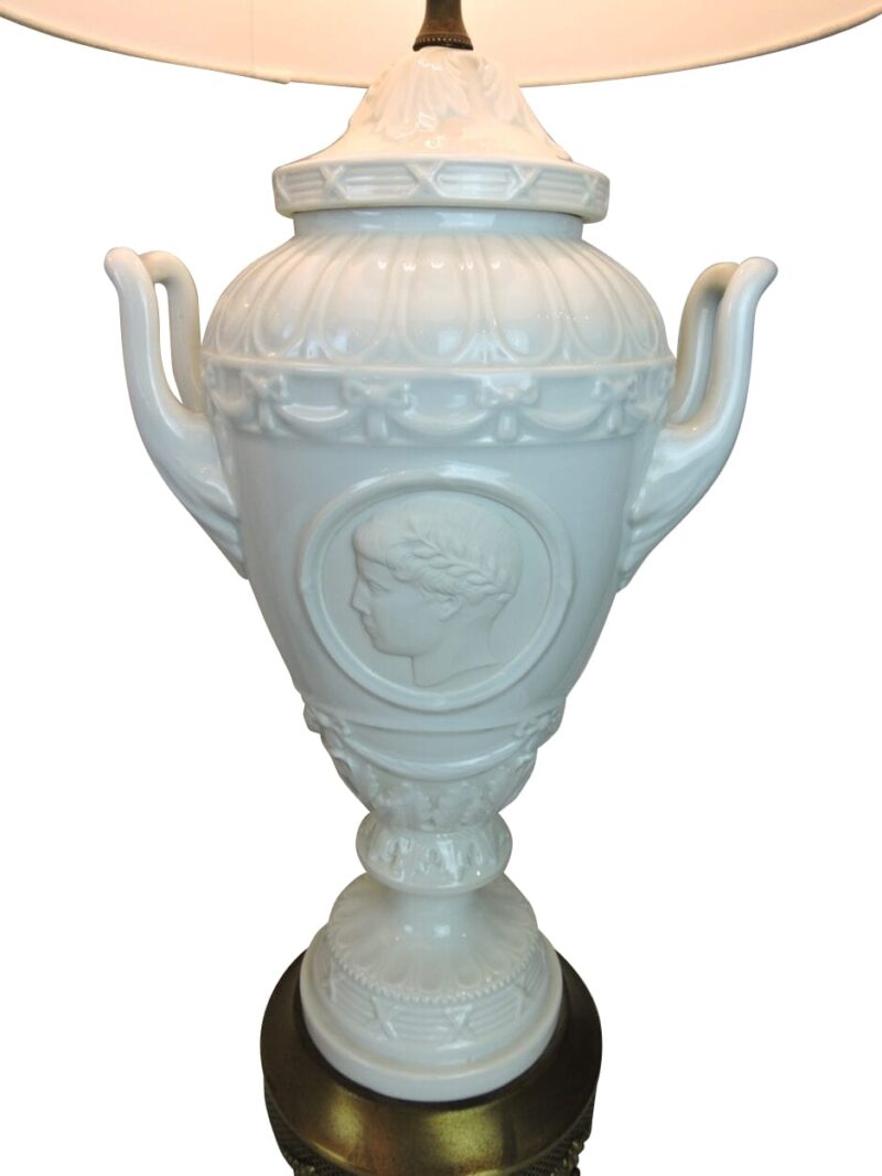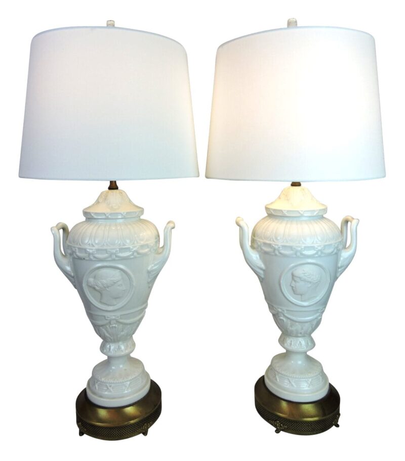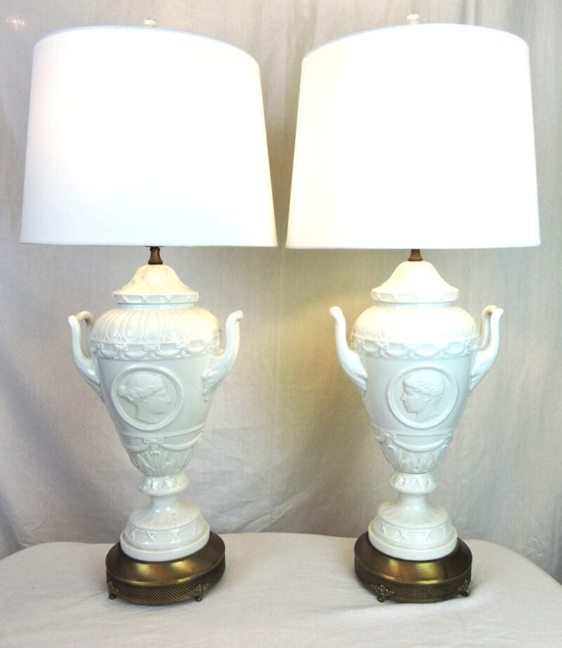 A pair of white, two handled porcelain lamps – each with a portrait – of Julius Caesar & of his wife Calpurnia.