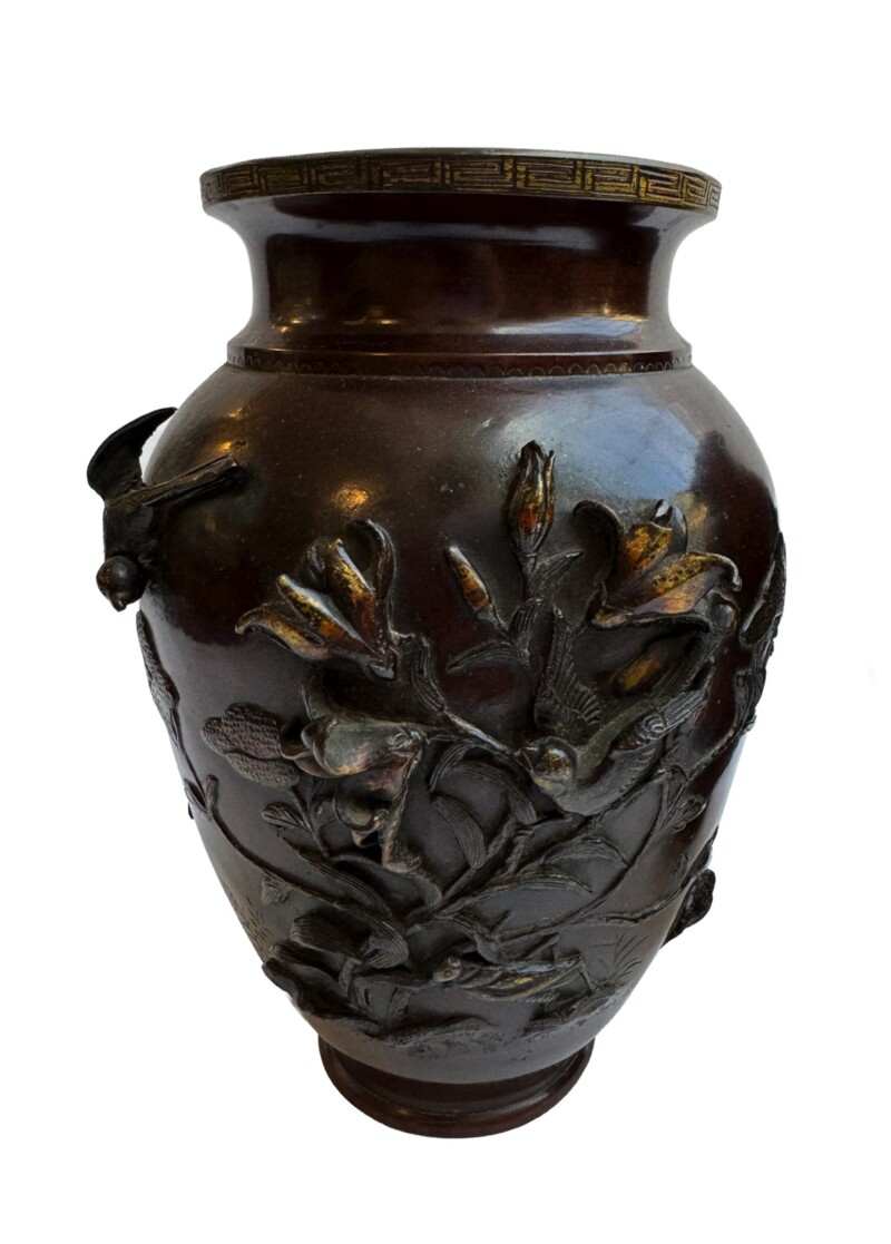 A handsome pair of Japanese bronze vases in a rich brown patina having birds and branches in relief on one side and perennial flowers in relief on the back side.  The rim of the vases has an engraved Greek key design.  The vases are thick bronze and are heavy for their size.