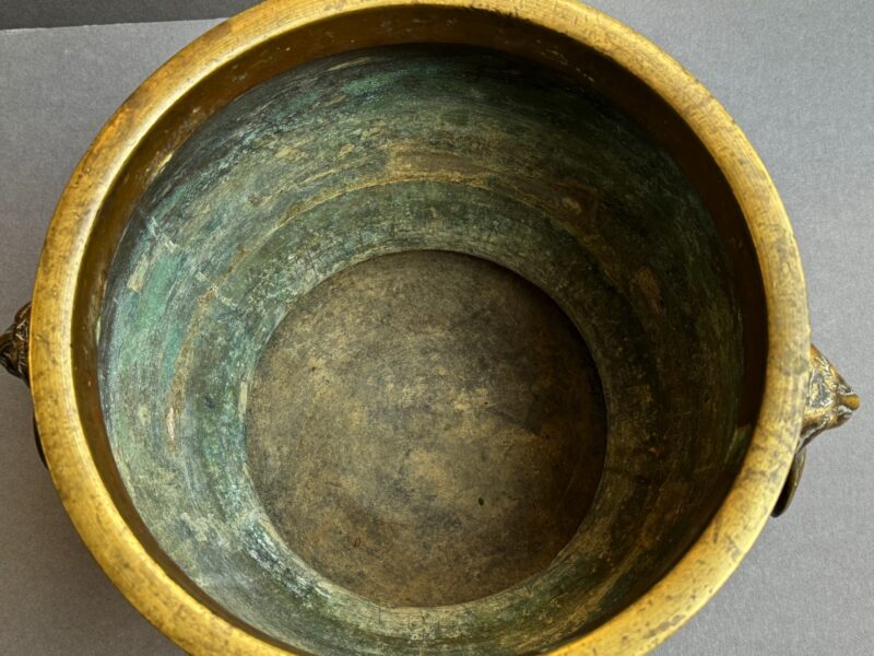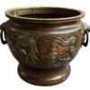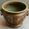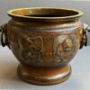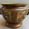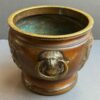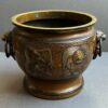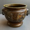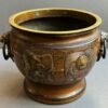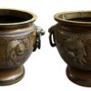 A beautiful quality of large bronze Japanese jardinieres with lion face handles with rings.  The decoration of dragons in relief with deep etched  scrolls and dots.  The jardinieres have a lovely brown patina.