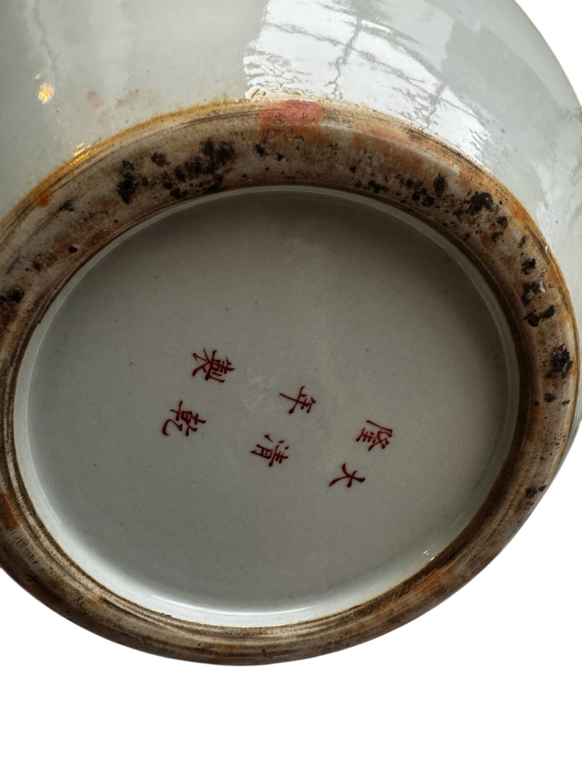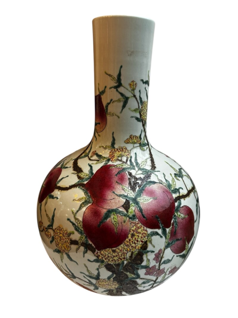 The Tianqiuping (“heavenly globe”) form, with its globular body and tall, narrow neck, originated during the Qianlong period (18th century) and remained a favoured shape for decorative presentation vases through the 20th century.