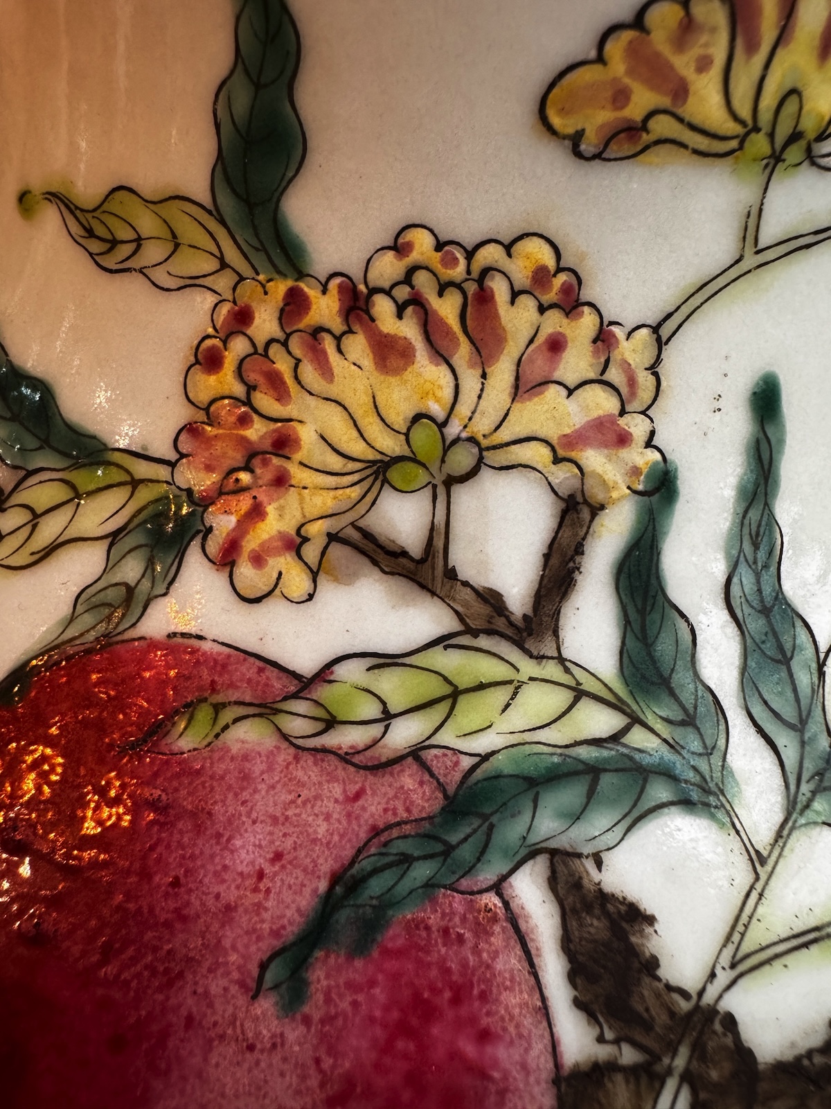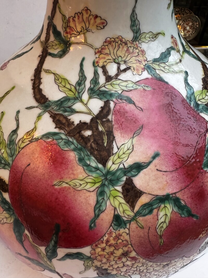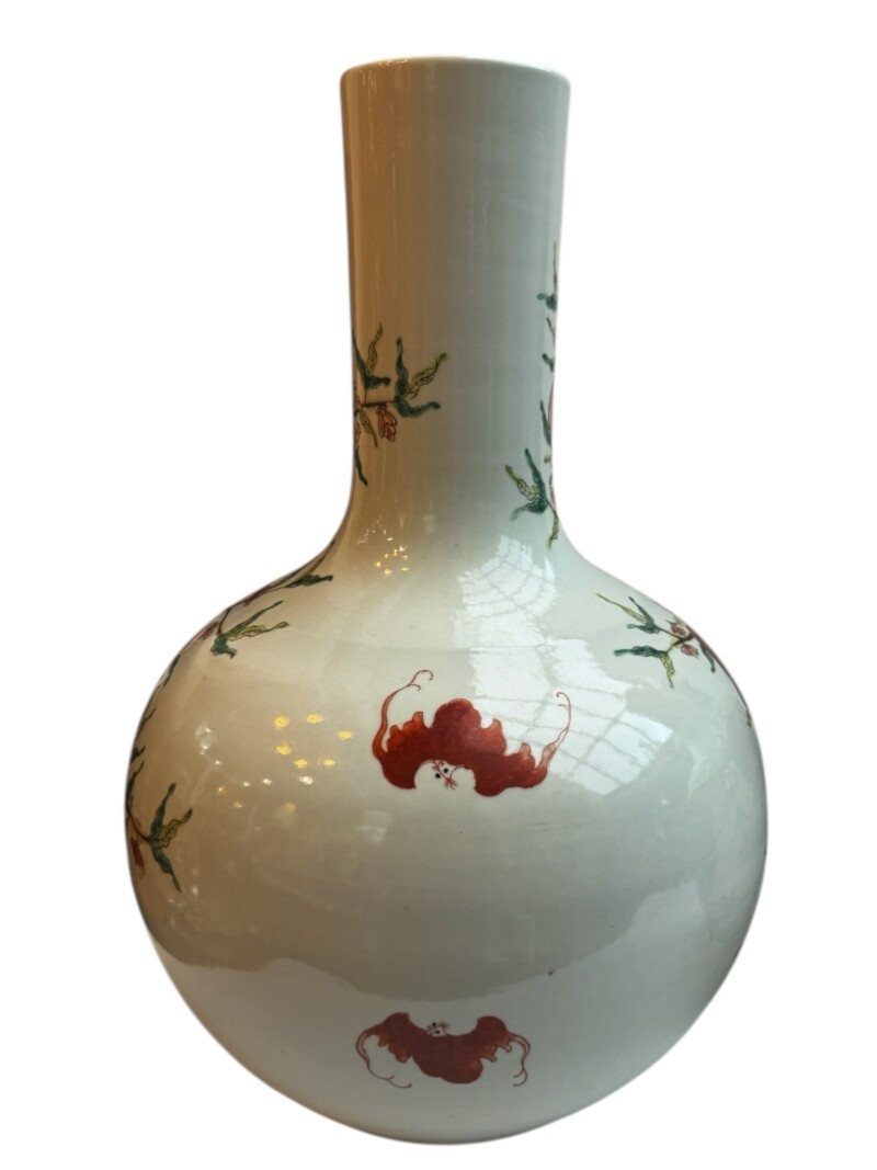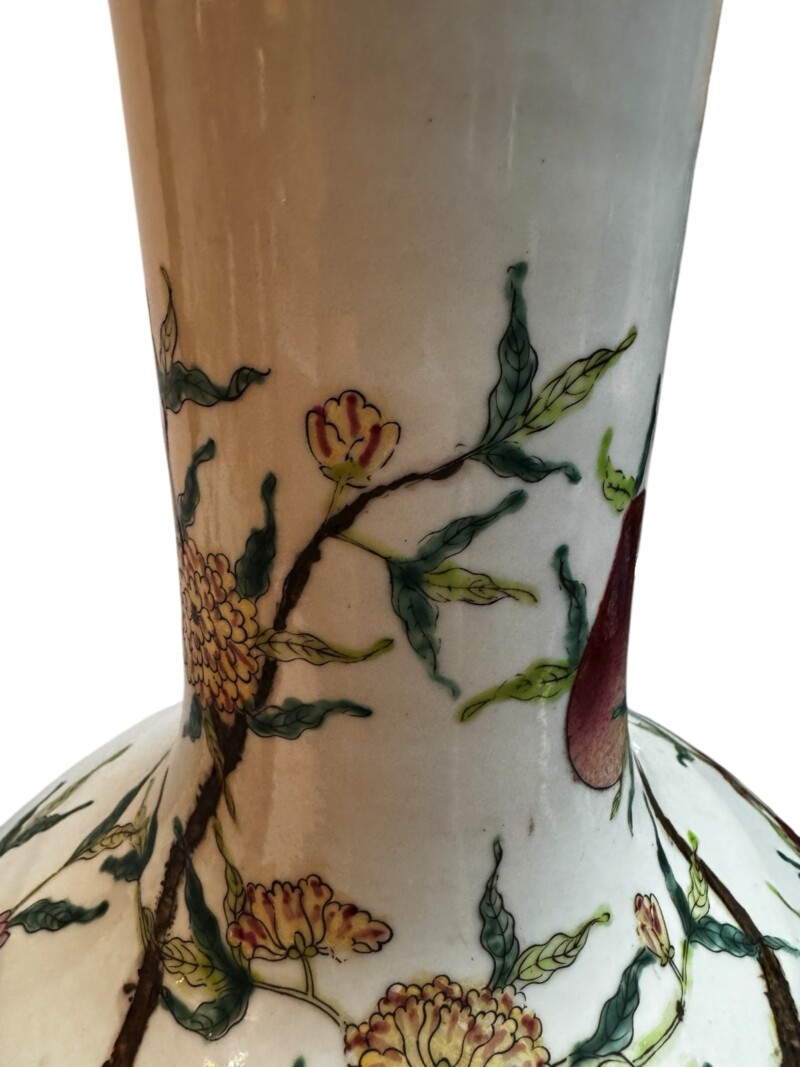 Oriental / Asian, PorcelainsA fine and impressive pair of large Chinese porcelain Tianqiuping vases, each beautifully hand-painted in enamels with the celebrated “Nine Peaches” design — a symbol of long life, fertility, and abundance.