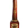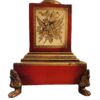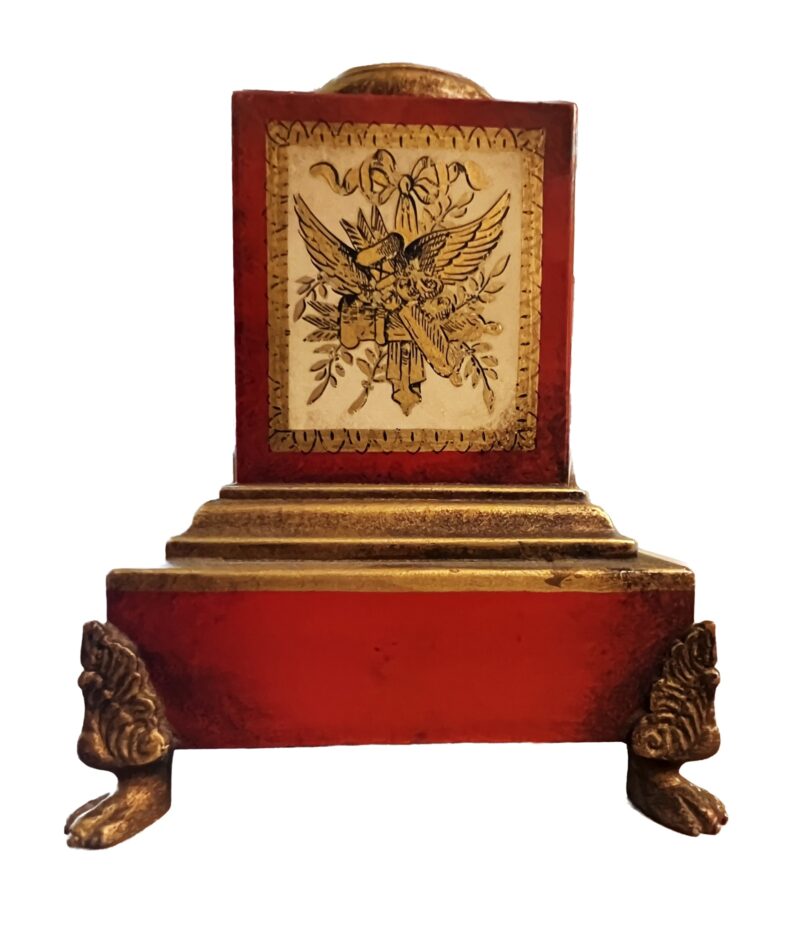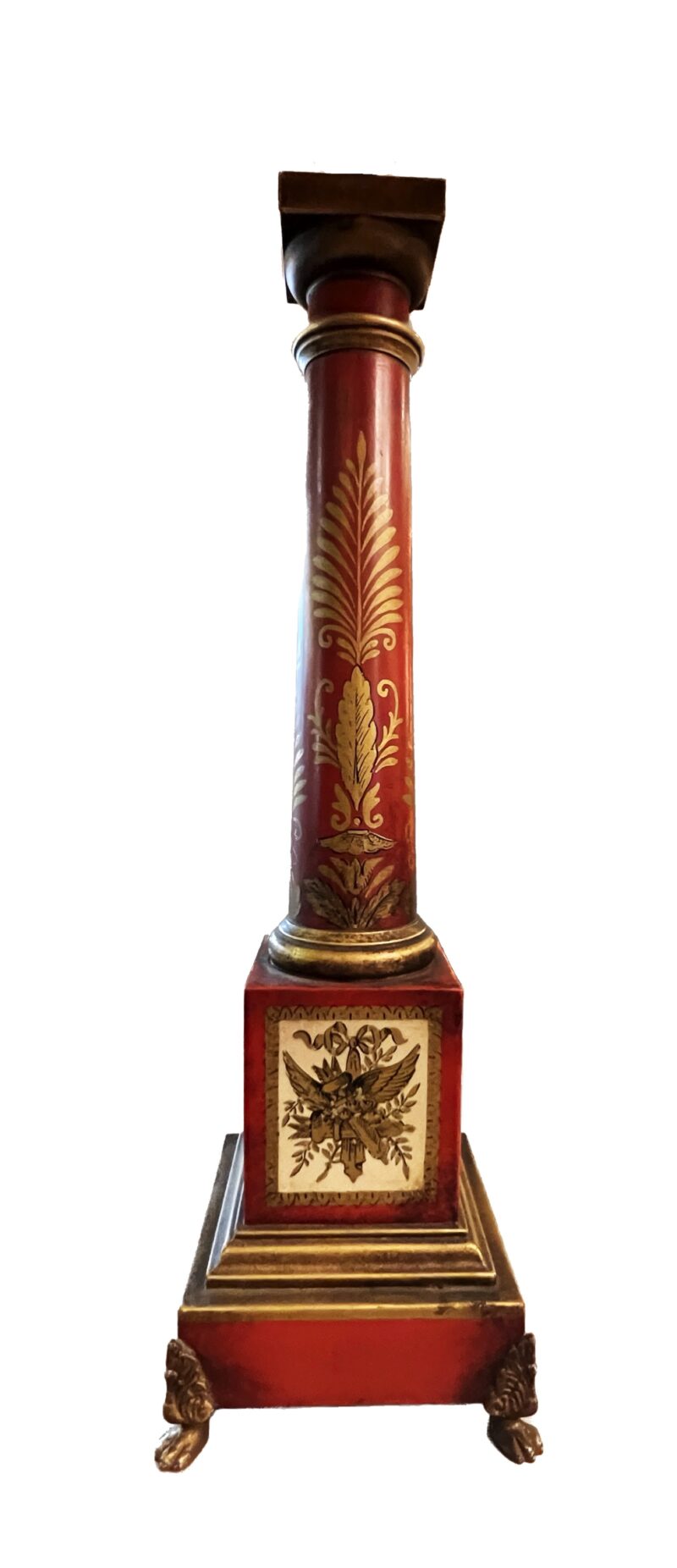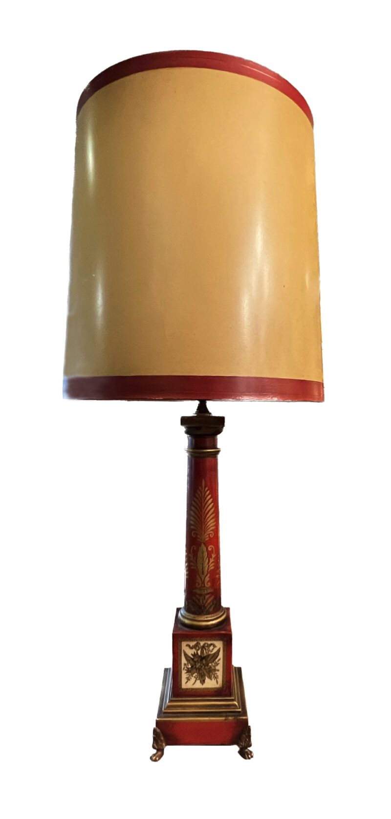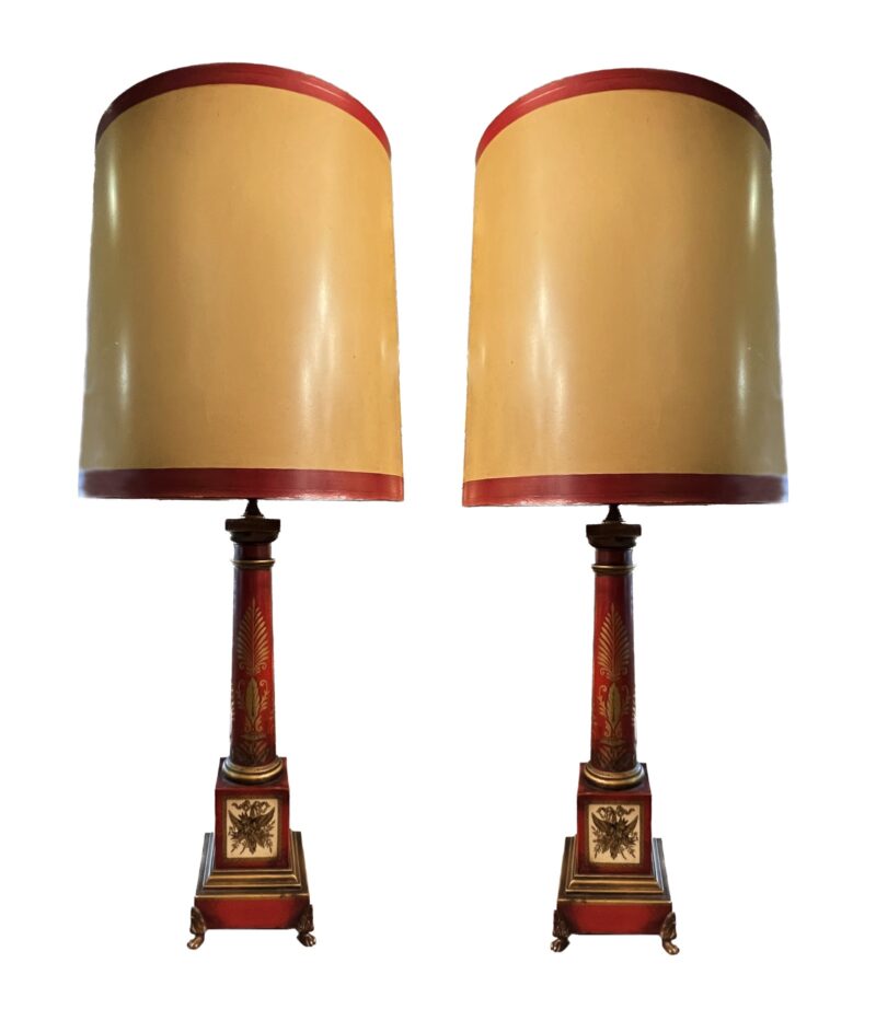 v** SOLD ARCHIVES **vImpressive pair of midcentury Italian tole metal lamps with a rich intensity of colour and elaborately painted. The square base has bronze painted lion feet. The lamp body and base is painted in a sophisticated red cadmium with yellow ochre detailed celebratory images of torches, wings, ribbons and leaves. The shades are original and beautifully painted to match the lamp body bringing a continuity to the “whole”.