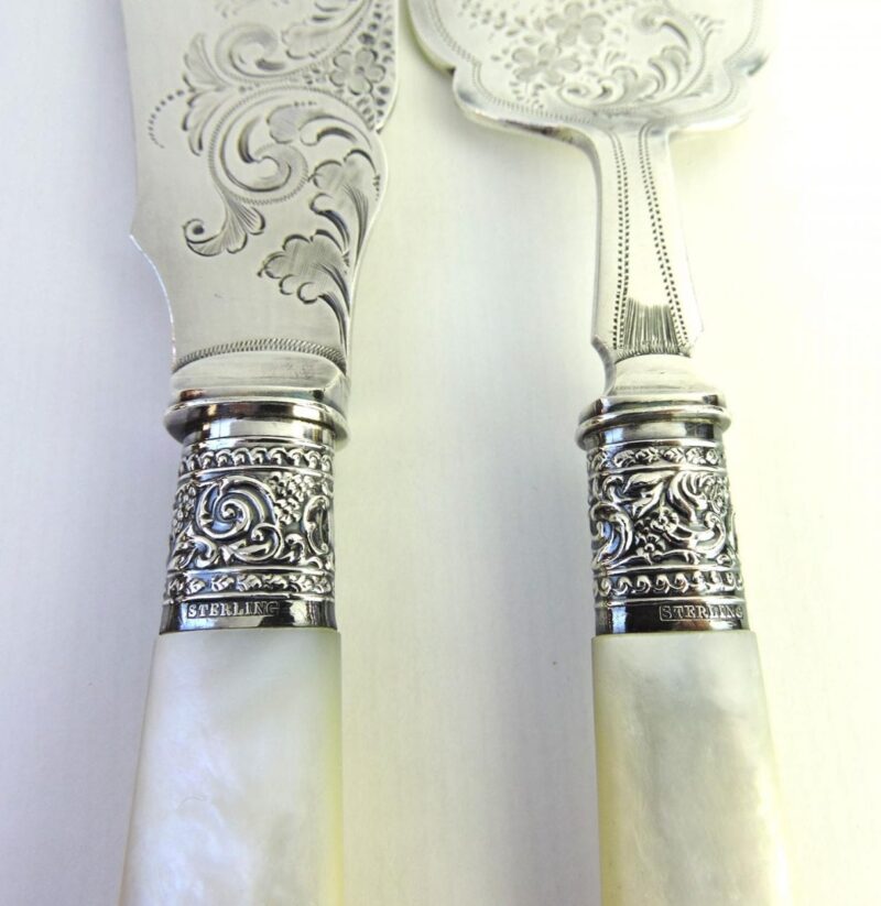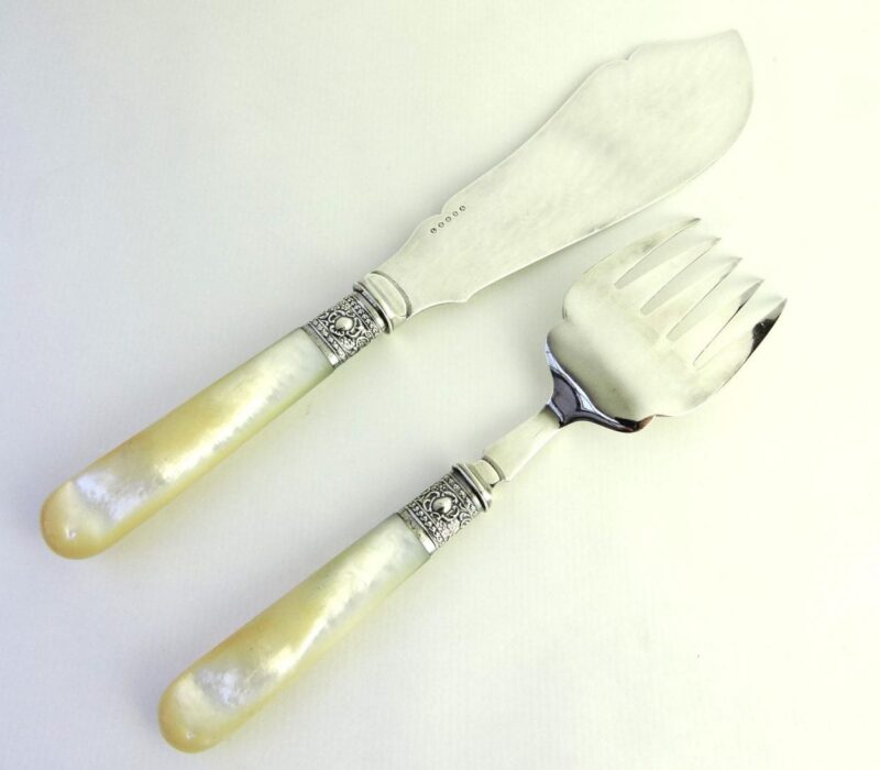 Pair of Mother of Pearl Handled Fish Servers with Sterling Bands c. 1910