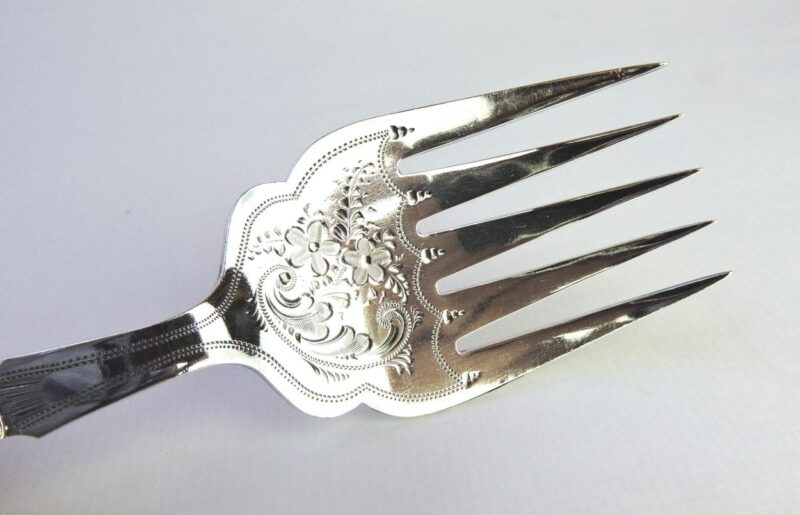 Here is a lovely pair of fish servers (knife and fork) with mother of pearl handles. The pair is made by Henry Rogers & Sons, Sheffield and have mother of pearl handles and a sterling band separating the handle from the rest of the server. They match the set of 12 fish set recently listed.